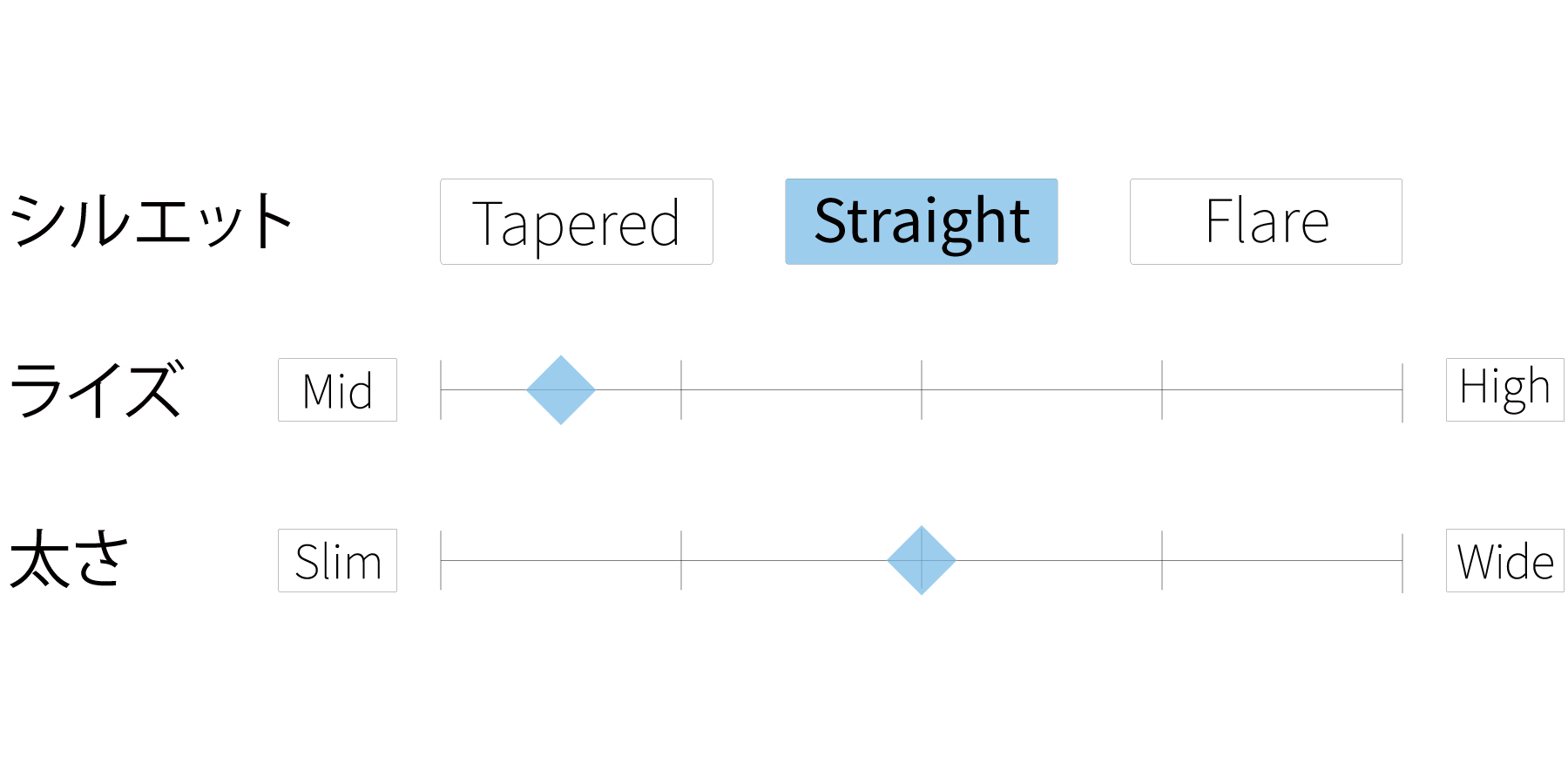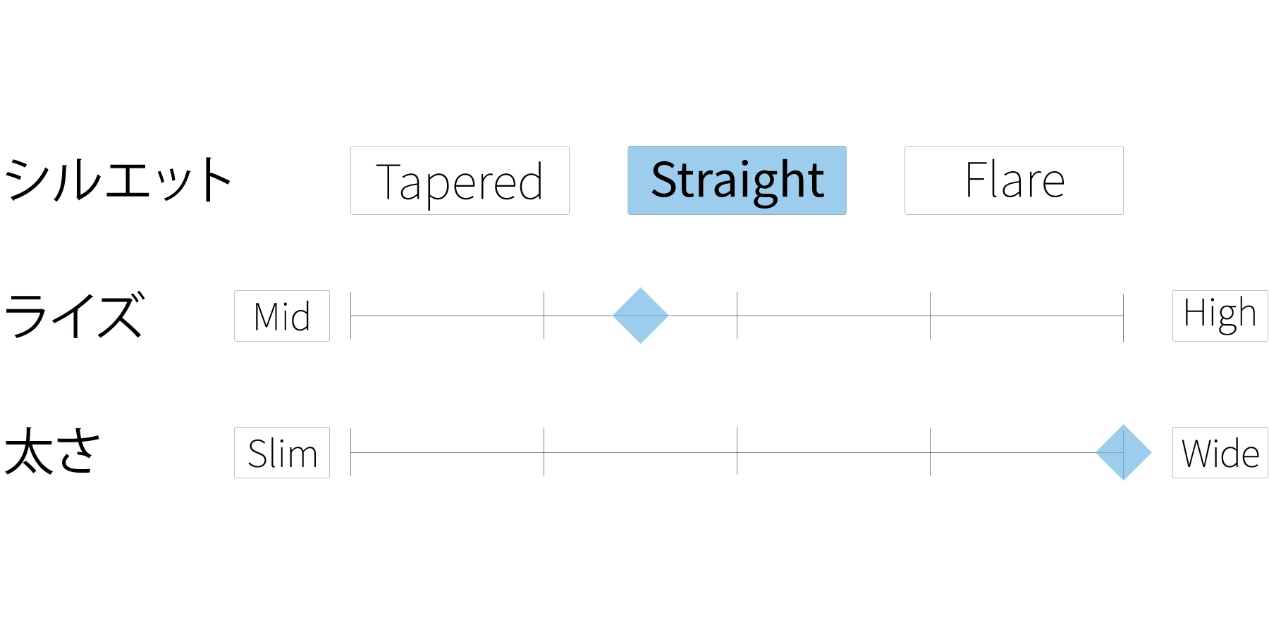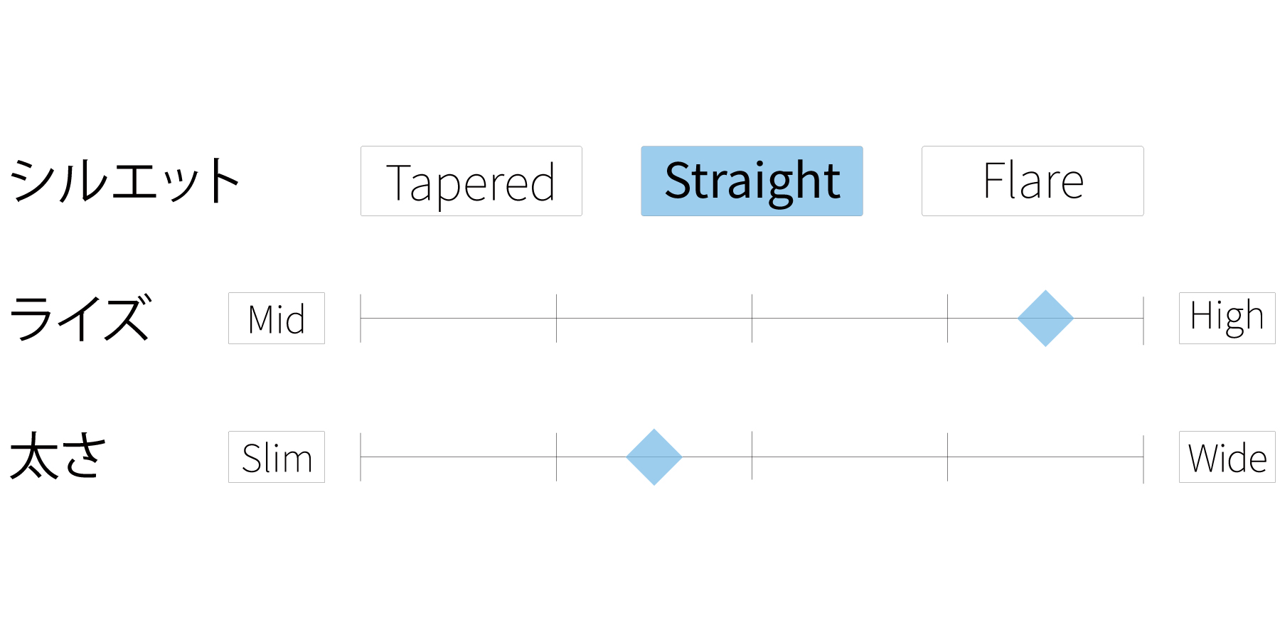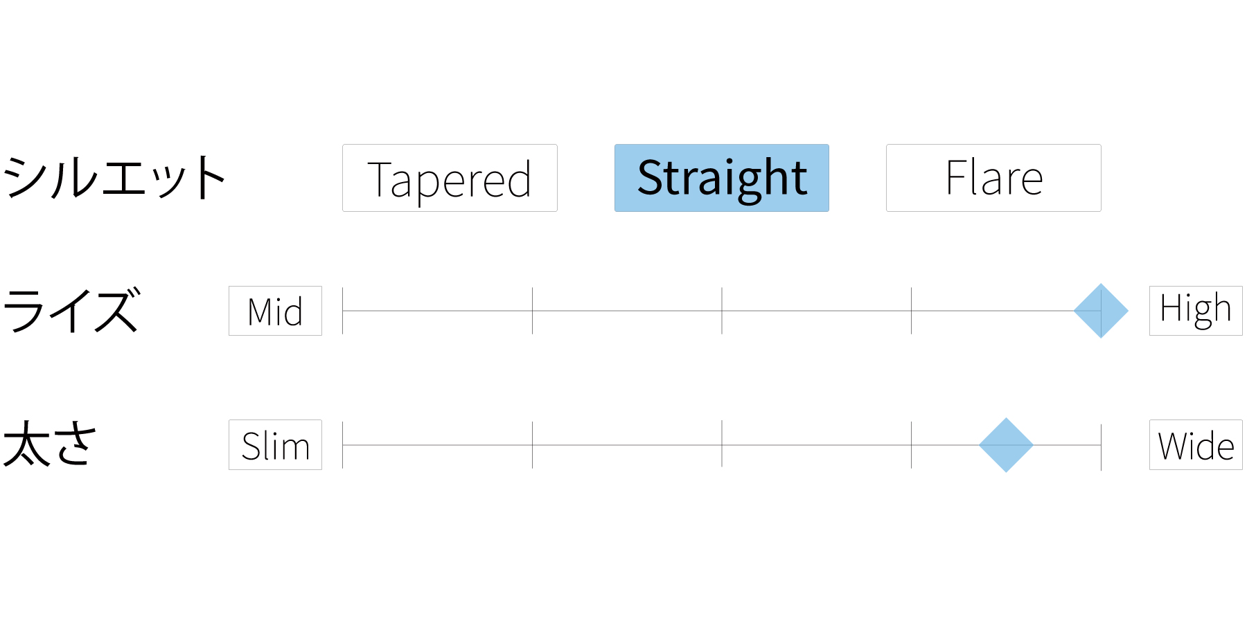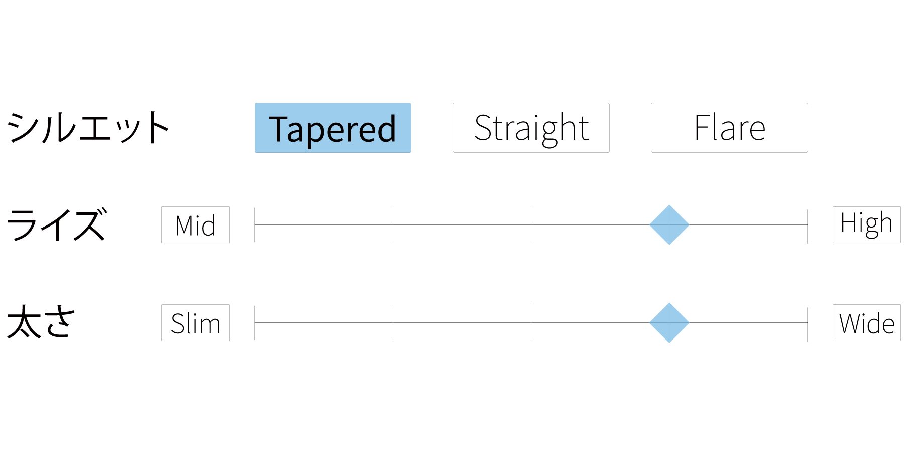 - ミッドライズですっきりとした腰まわりと、まっすぐ伸びるレッグラインが脚全体をシャープな印象に整えます。