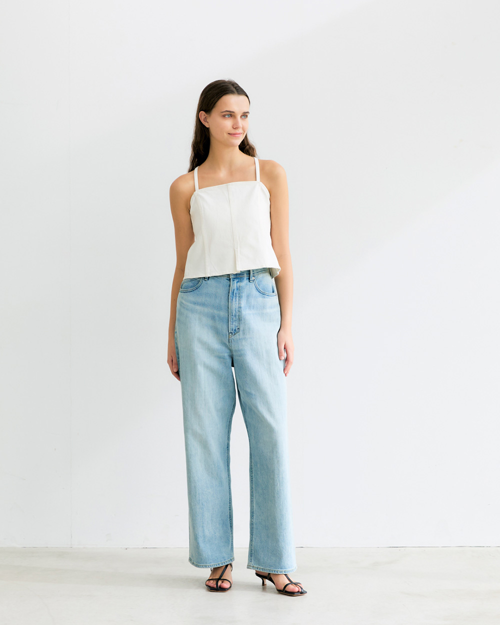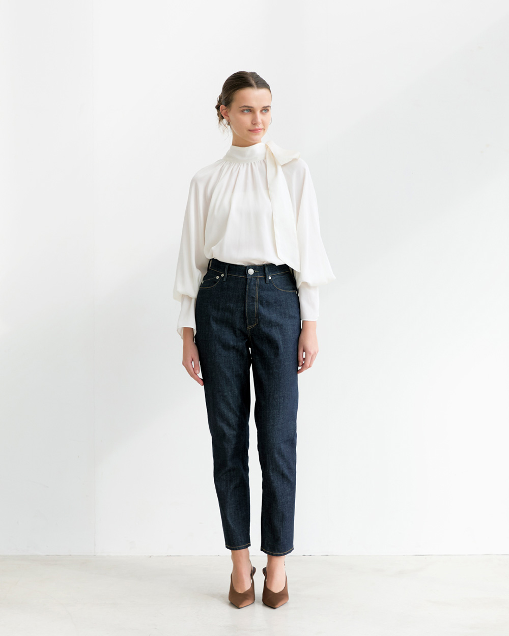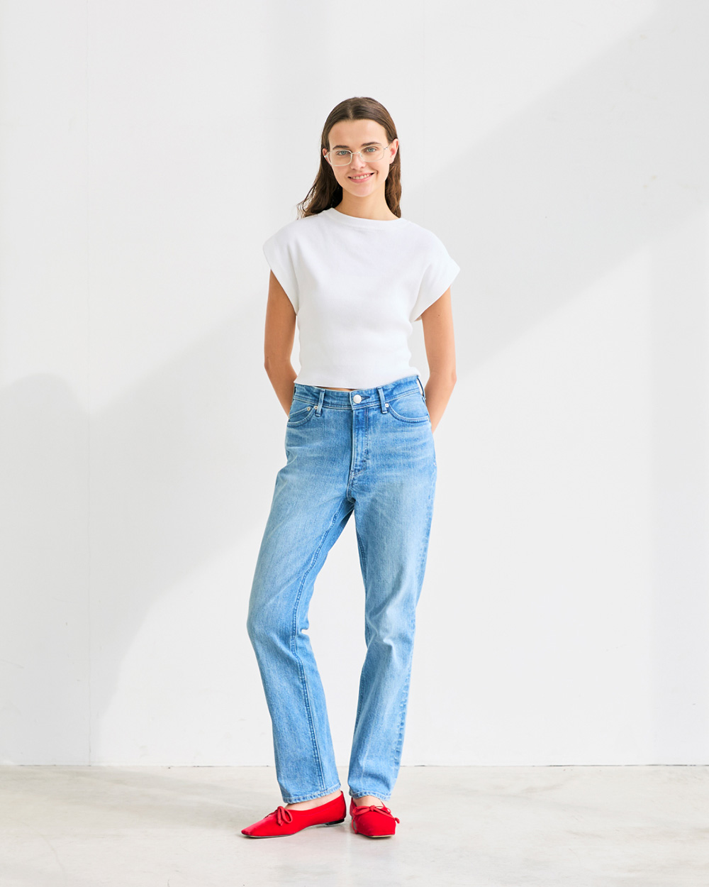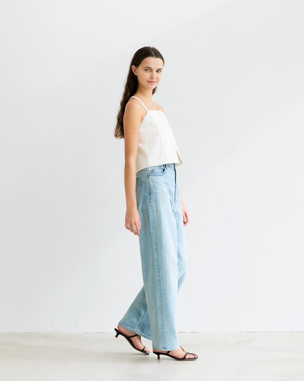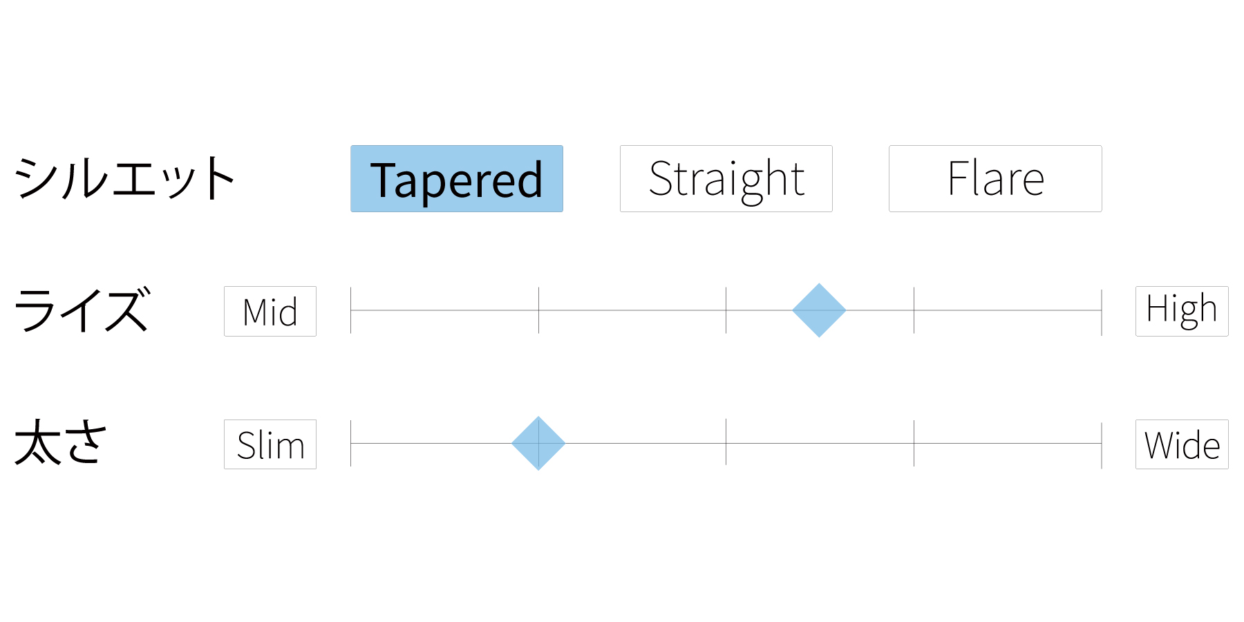 - ミッドライズですっきりとした腰まわりと、まっすぐ伸びるレッグラインが脚全体をシャープな印象に整えます。