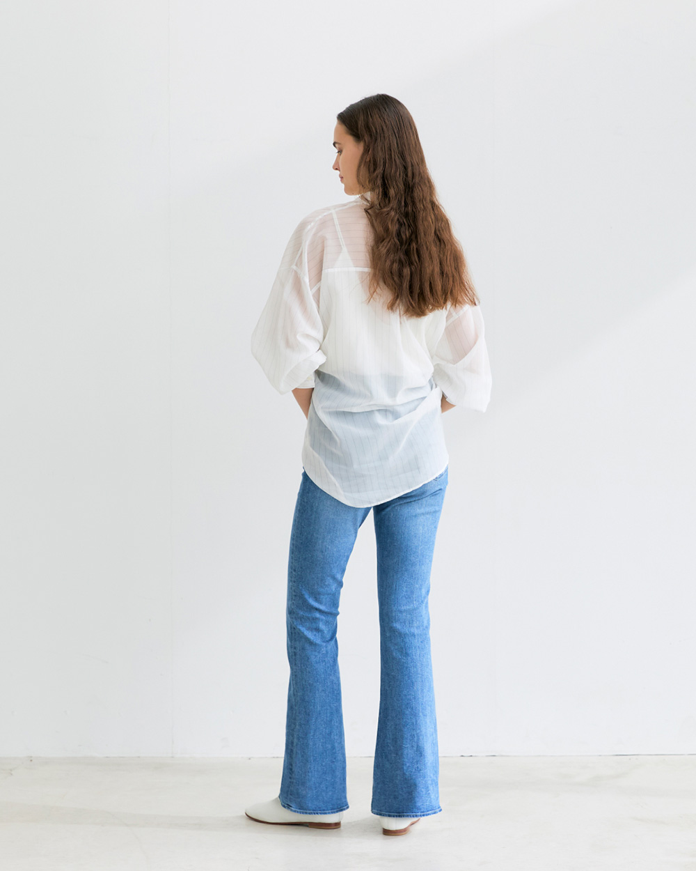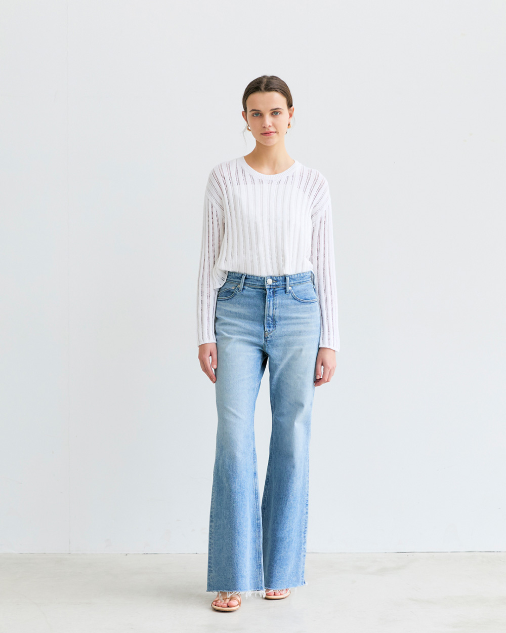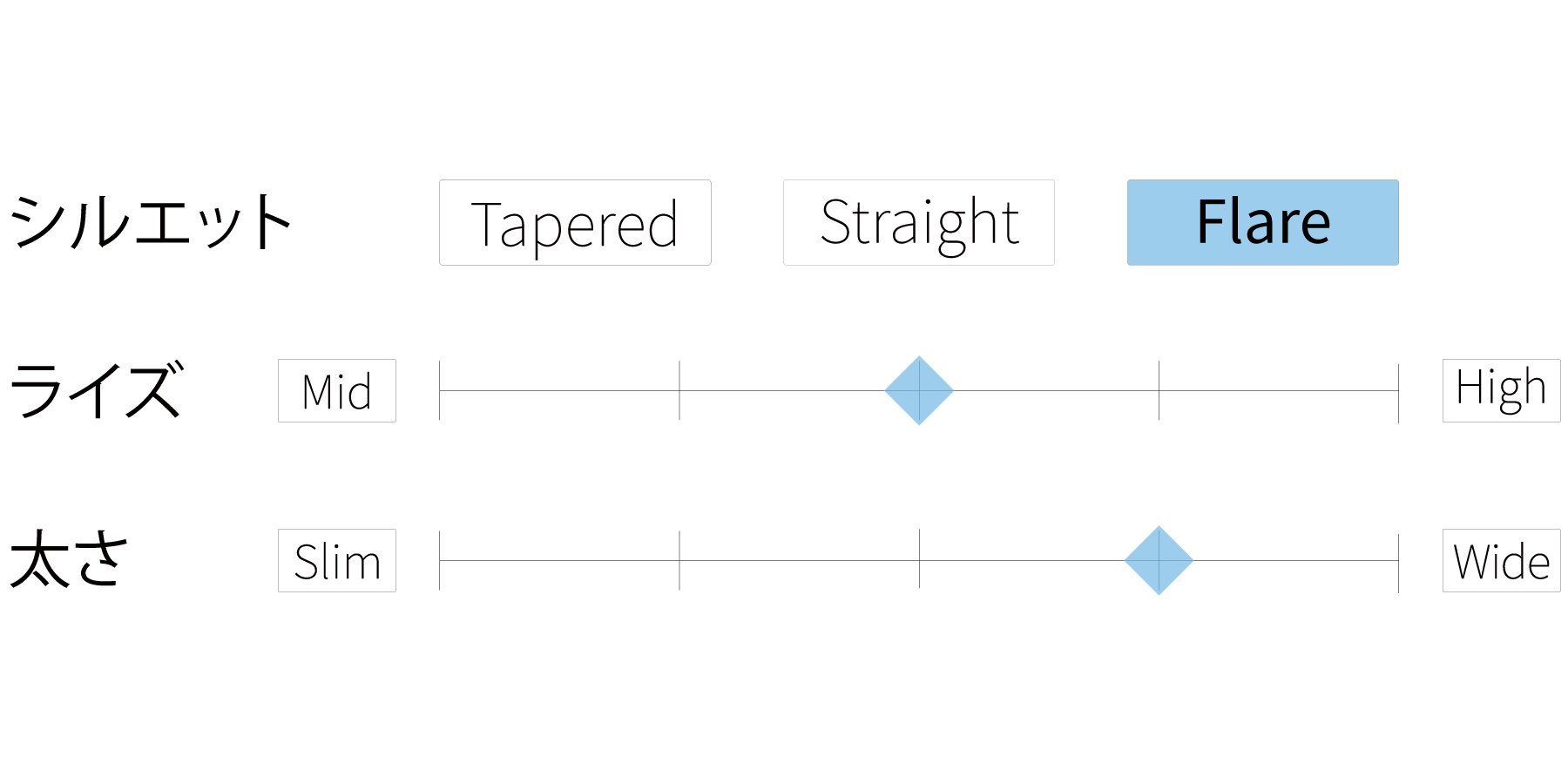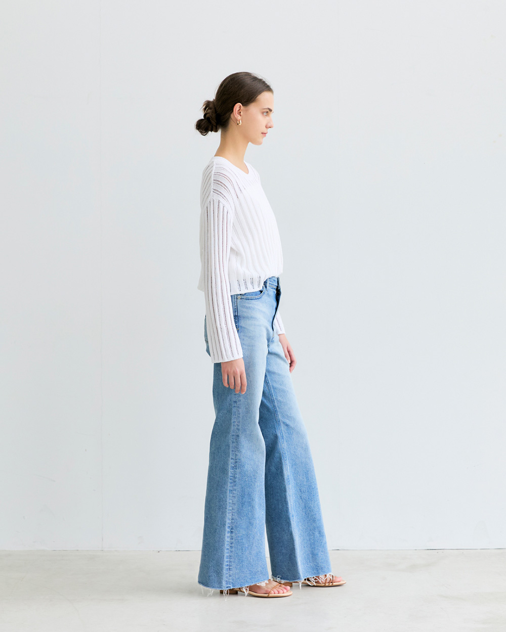 - 高めに設定した膝位置が重心を上げ、自然なスタイルアップに。フレアに挑戦しやすいバランスです。