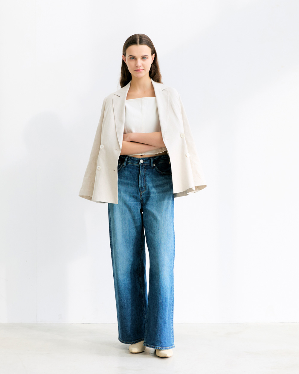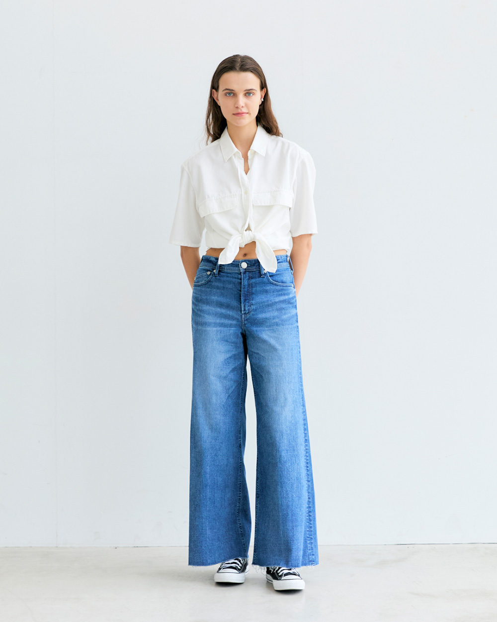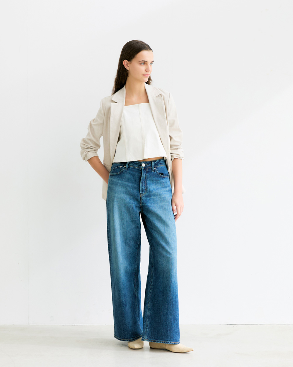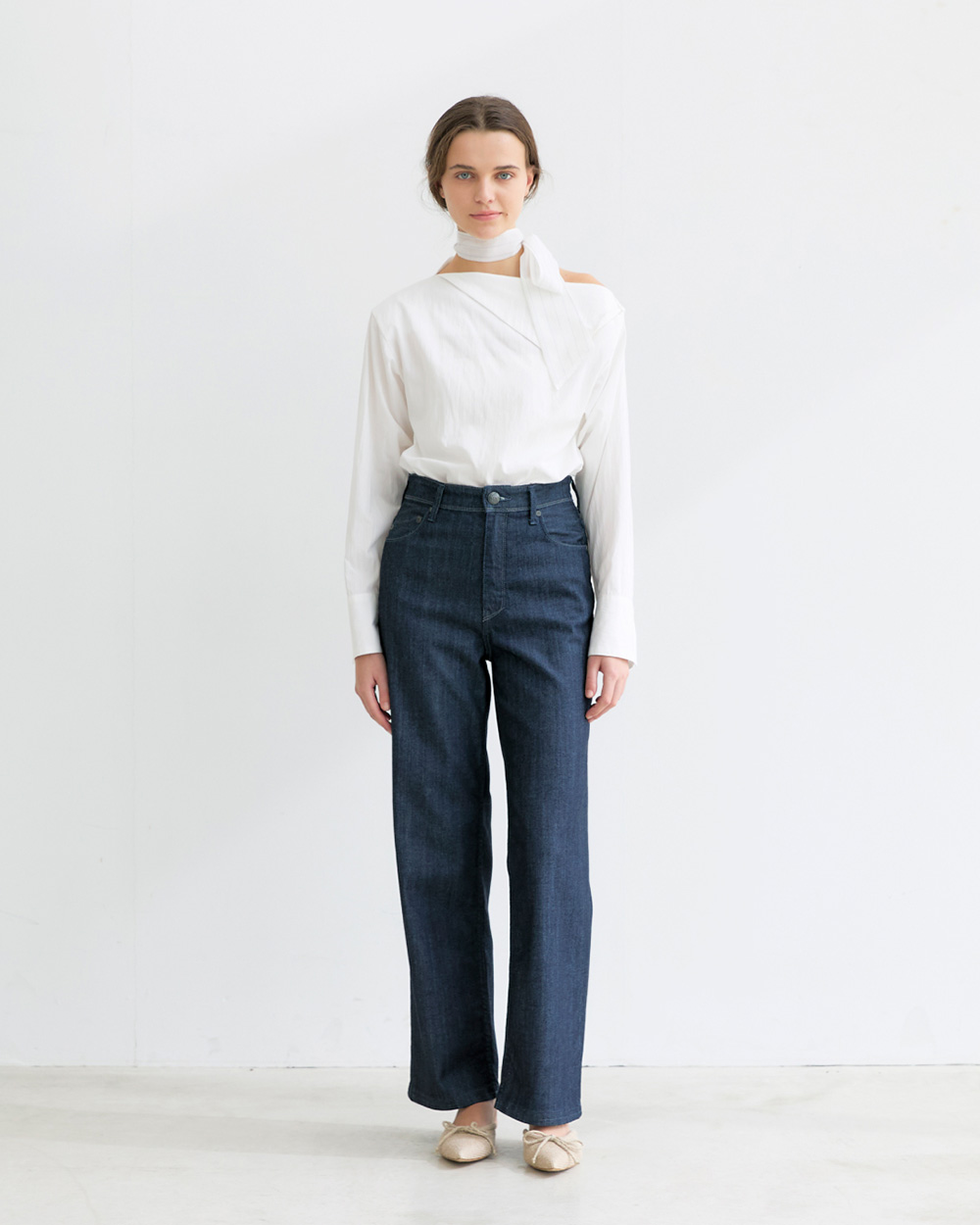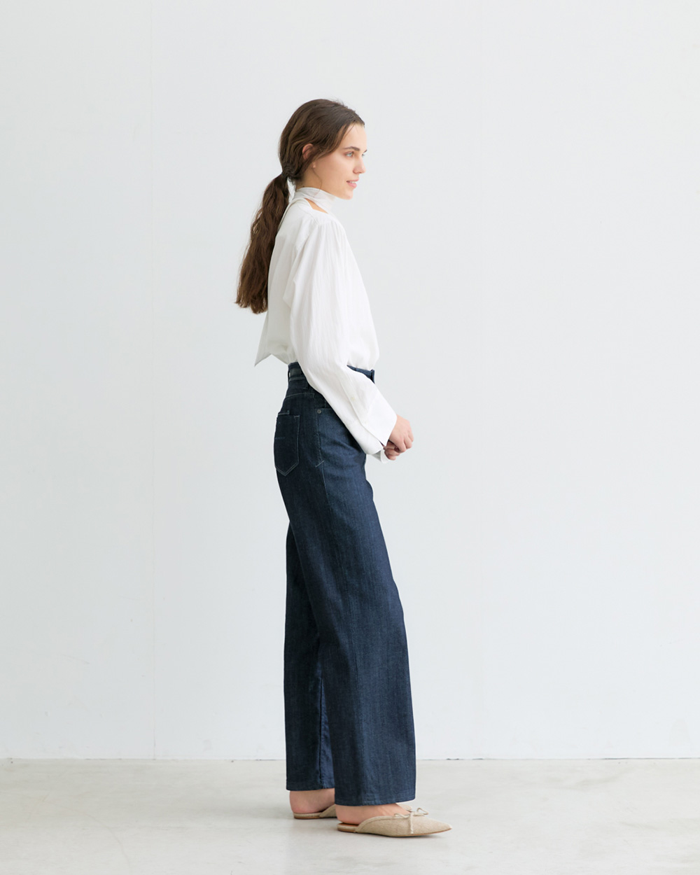 高めのヒップ位置で横に広がらず、軽やかに穿けます。 - ハイライズでウエストをコンパクトに見せ、ルーズながらも女性らしいメリハリを演出。穿くだけで華奢見えが叶います。