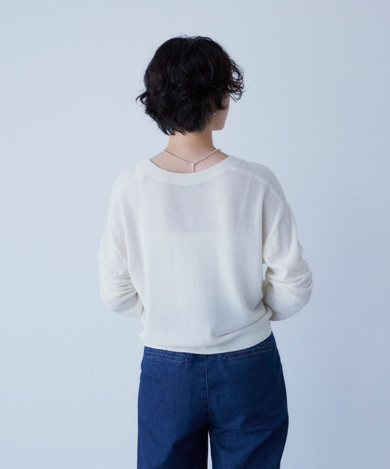 レーヨンとナイロンをブレンドしたモール糸を使用し、なめらかな落ち感と程よいハリを両立。羽のような繊維が絡み合った独特の表情が、見た目にもやさしい印象を与えます。12ゲージの天竺編みによって、上品で軽やかな仕上がりに。厚すぎず薄すぎない程よい肉感で、長い期間着ていただけます。