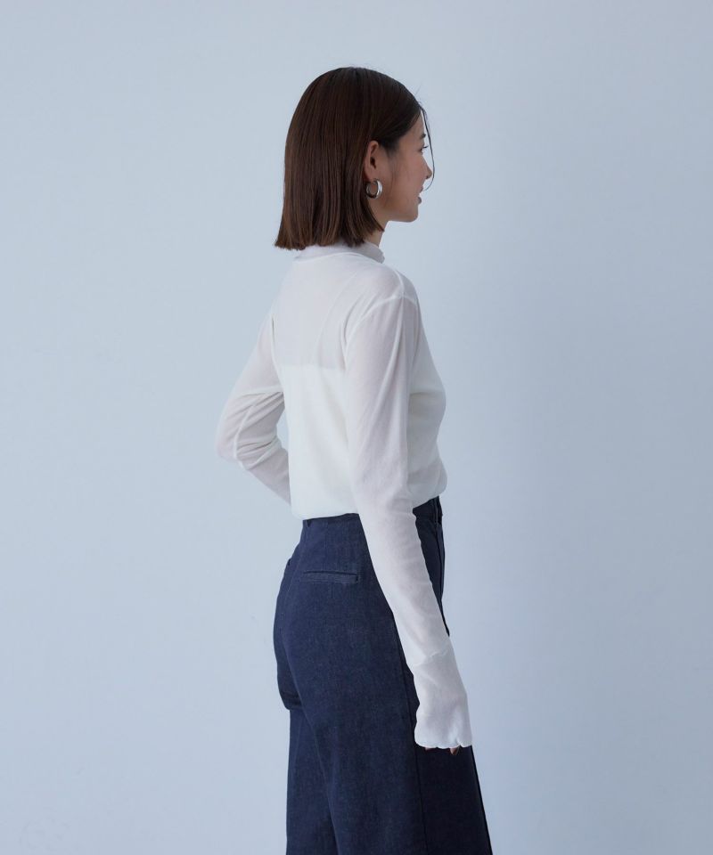 なにかとレイヤードに重宝するハイネックのベロアロングスリーブです。タイトシルエットながらストレッチ性があるので、窮屈になりすぎず着ることができます。適度な透け感があるので、インナーとしてはもちろん、一枚でもサマになるロングスリーブです。袖口が少しフレアになっていたり、さりげなくスリットが入っていることで、レイヤードした時もチラ見せするのにこなれ感が出ます。