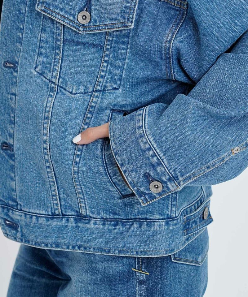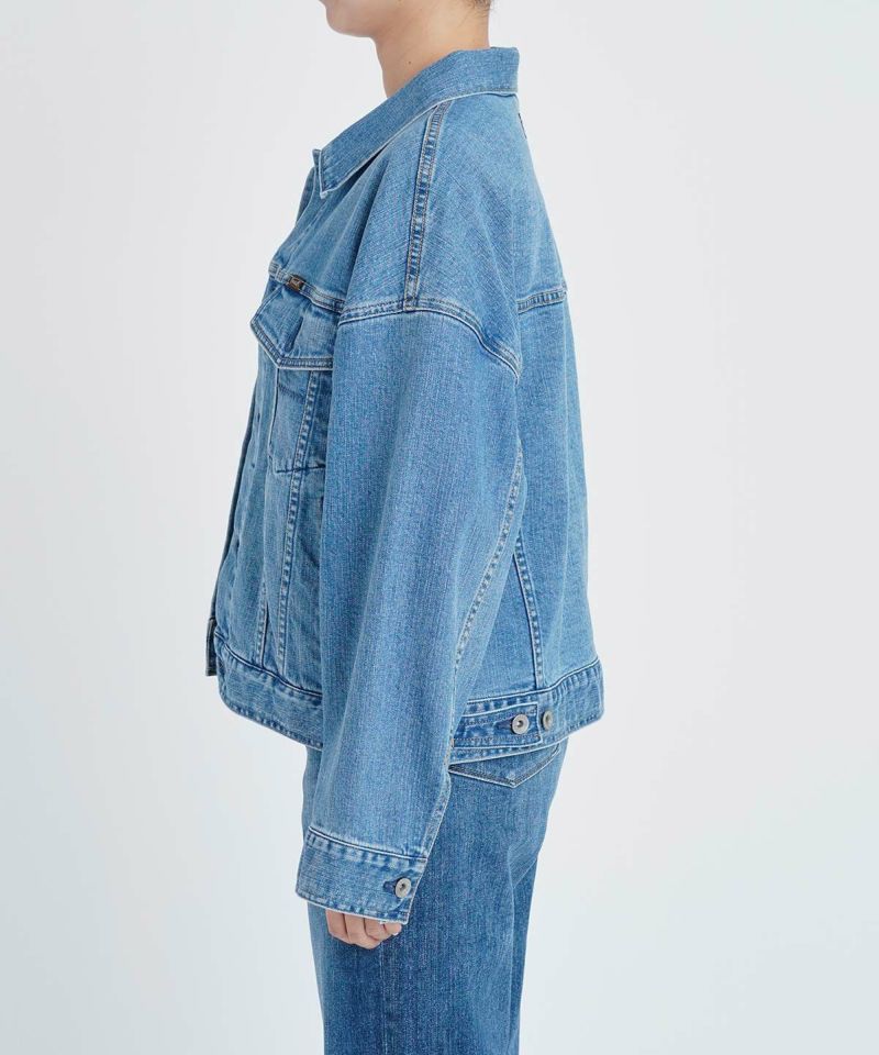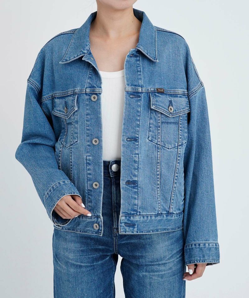 オーバーサイズでコンパクトな丈感が合わせやすい旬なジーンジャケットです。肩がドロップしたゆったりとした着心地のジーンジャケットです。ジャケットの中にボリュームのある袖のものもゆったり着れます。ゆったりしたフォルムですが、丈はコンパクトに、ワイドめなパンツにも合わせやすい丈感で、ゆったりと着崩して着用しても今っぽく着こなせます。