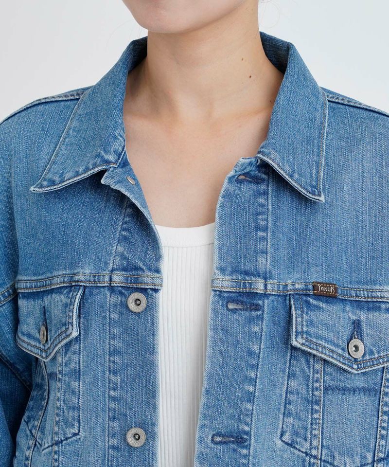YANUKらしいきれいめの中淡色のジーンジャケットです。ヴィンテージのような自然で本格的でありながら、かつ女性らしさを残した加工感となっています。きれいなブルー色で年間通して着まわせるカラーです。