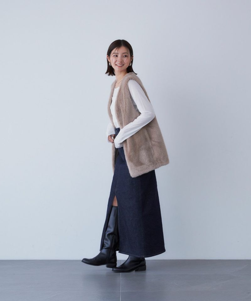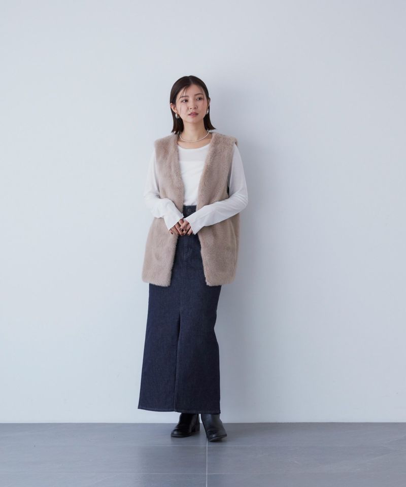 Iラインシルエットのロングスカート。腰回りがフィットしていて、裾に向かって真っすぐ落ちるすっきりとしたシルエットです。前スリットがポイントで、抜け感を演出しつつ足さばきしやすく、大人な印象を与えてくれます。腰回りがスッキリとしていて丈が長めなので縦のラインを強調し、脚長効果が期待できます。クロップド丈のトップスとも相性がよく、バランスよく合わせられます。ウエストの位置をミドルウエストで合わせてもらうとこなれ感がでて、今っぽく穿いていただけます。