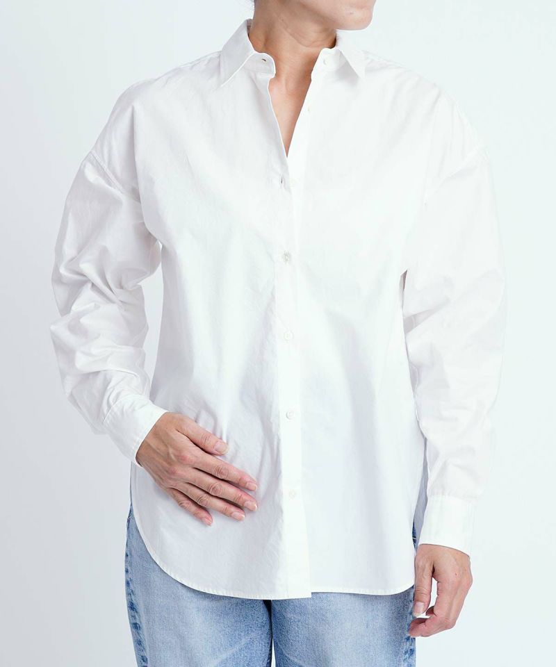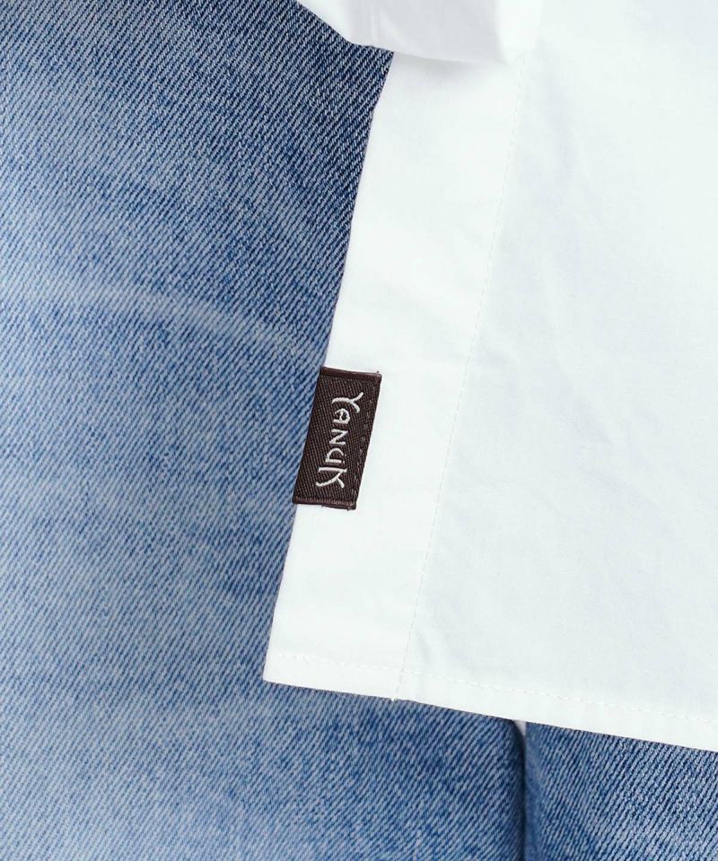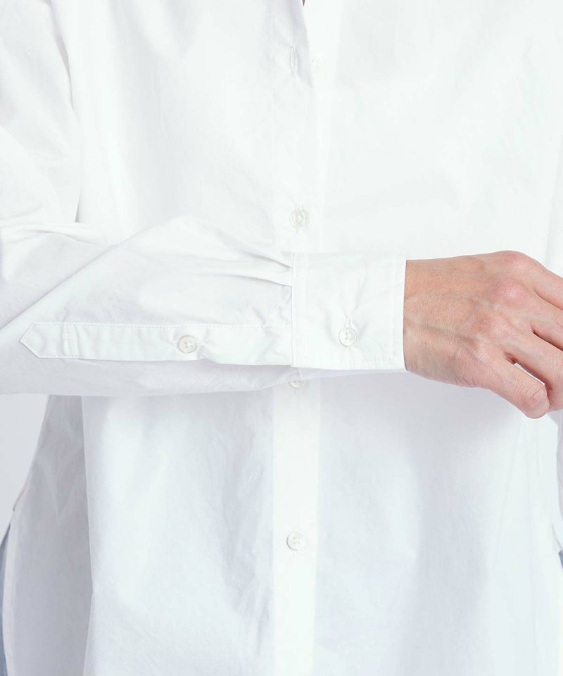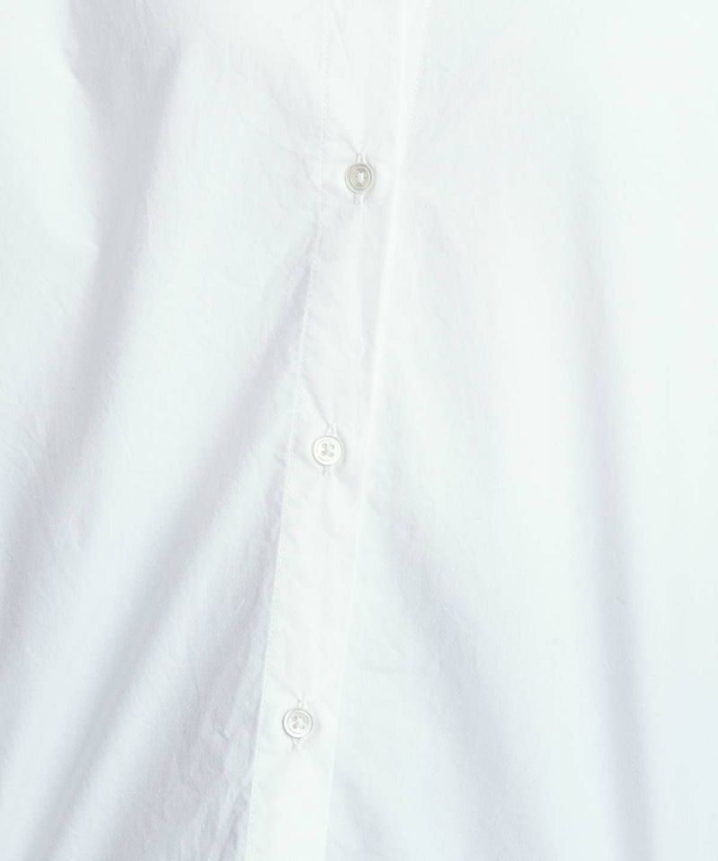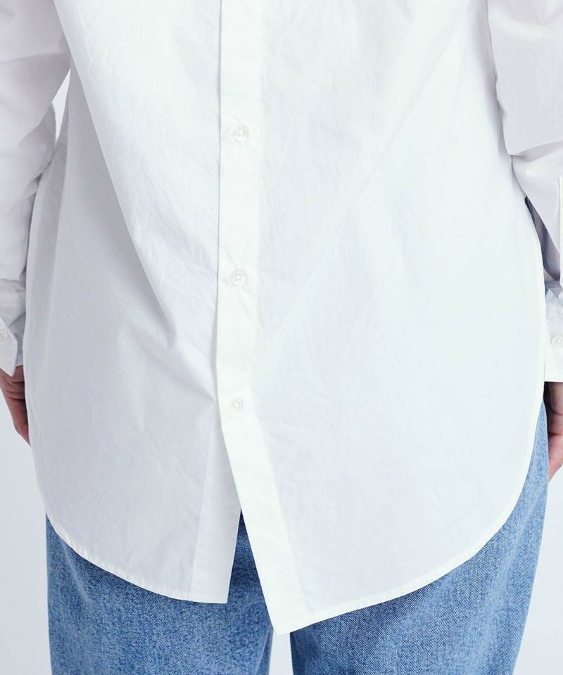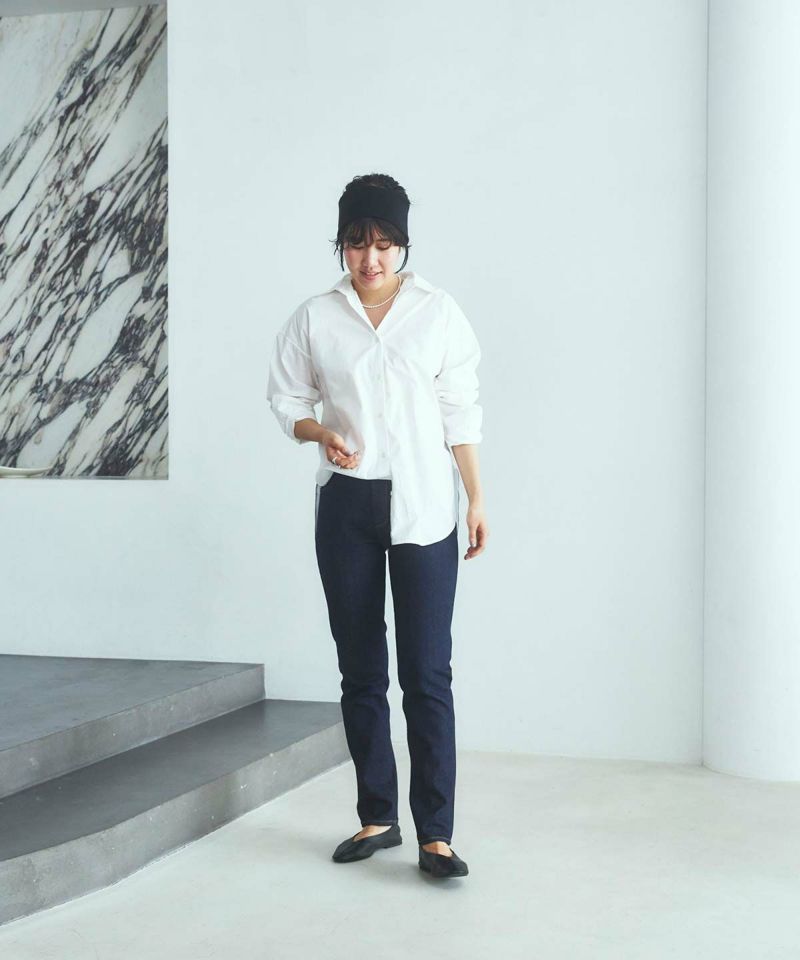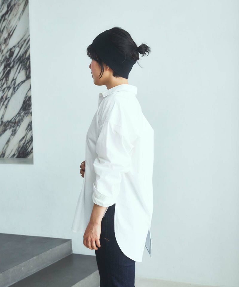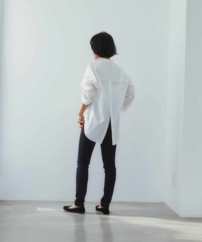 シンプルながらデザイン性のあるバックボタンのデニムシャツです。シルエットは、すっきりとしたボクシーシルエット。キチンと見えするシャツですが、着方でイメージを変えられる万能シャツです。ポイントは後ろにボタンがついていて、後ボタンをあけて着るとスリットのように見せられます。前ボタンをしっかり閉めてボトムスにインするとクラシカルムードに。第2ボタンまであけて衿をぬき、前だけインするとラフなムードにもなります。ミドルウエストのパンツには裾を出して、ハイウエストのパンツには前だけインするとコーディネートのバランスがとりやすいです。