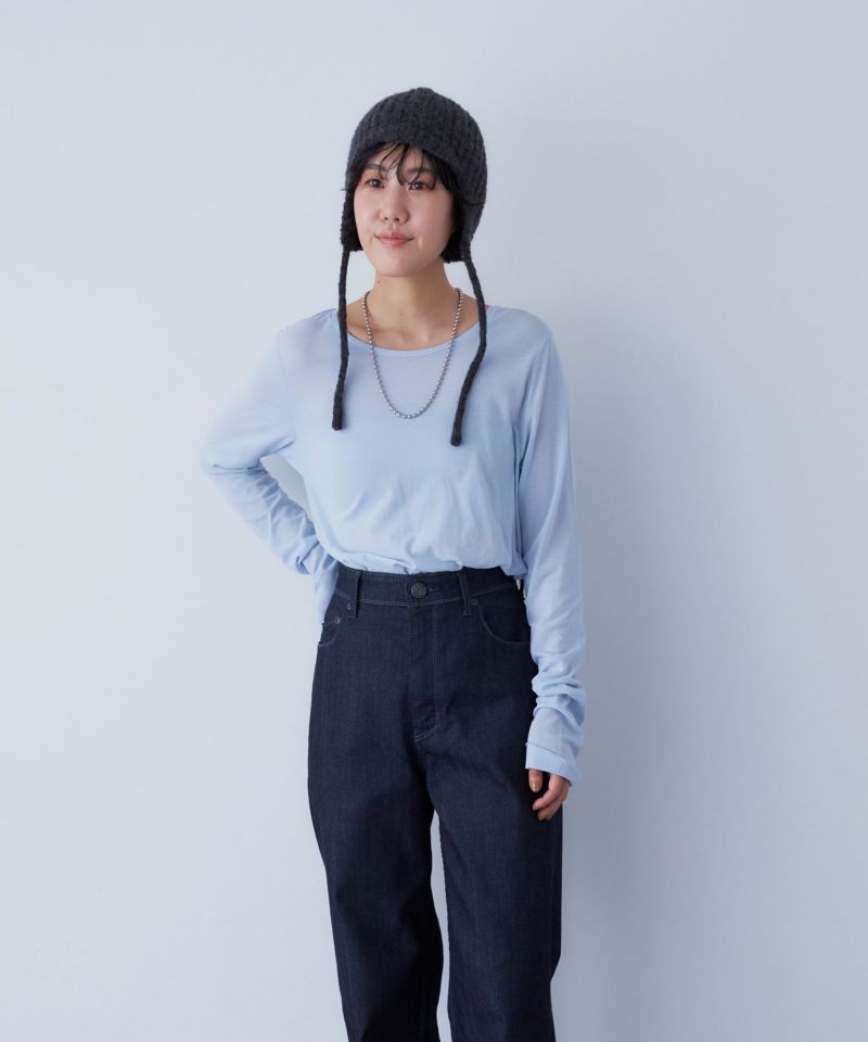 一枚でも重ね着としても重宝するシアーロングスリーブです。適度に開いたネックまわりが、レイヤードするのに着まわしやすい開き感になっています。少しくしゅくしゅっと着れる、長めの袖丈もポイントです。