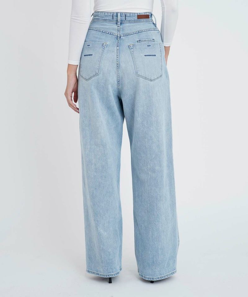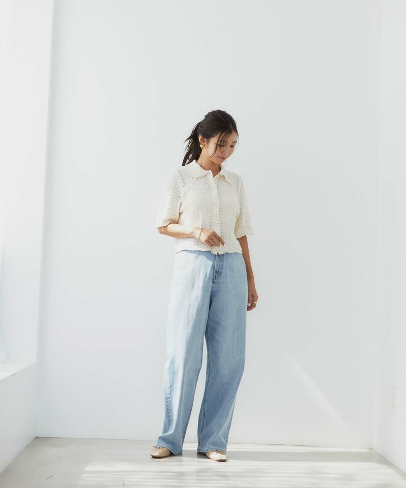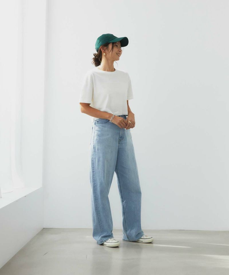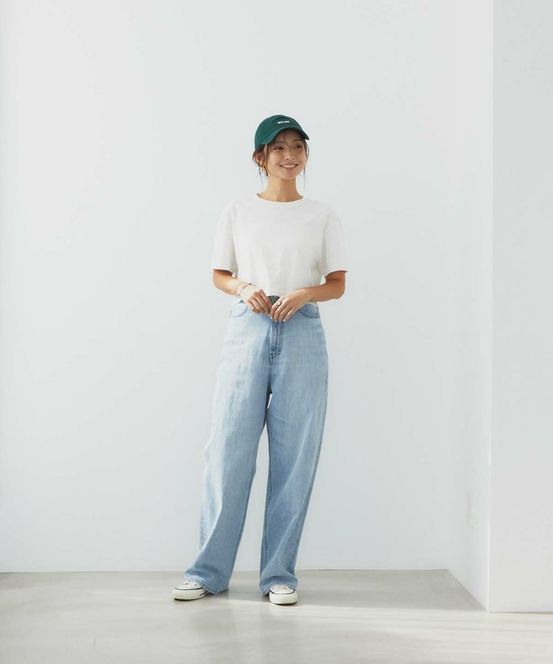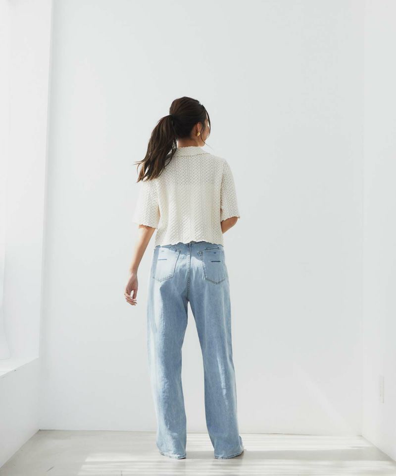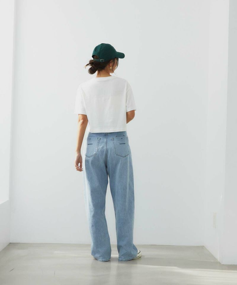 太腿から裾にかけて太いストレートシルエット。メンズの太めジーンズを女性が穿きこなすイメージです。メンズらしい印象にするため、あえて股ぐりを長くし、ヨークの幅や後ポケットを大きくしています。実際にメンズサイズを穿こうとするとウエストが合わなかったり、重さで下に下がってしまったり落ち着きが悪いですが、このジーンズは、ウエストがキュッとしまったジャストサイズなので、着心地のストレスなく穿いていただけます。ボリュームのあるパンツですが、ウエストがしまっていることにより、ウエストが細く見え、着ている人を華奢に見せてくれます。またボリュームが横に広がらず、ヒップの高さから下に落ちるので、後ろ姿の野暮ったさもありません。脚の形を気にせず穿ける太めストレートなので体型を選ばず着ていただけます。