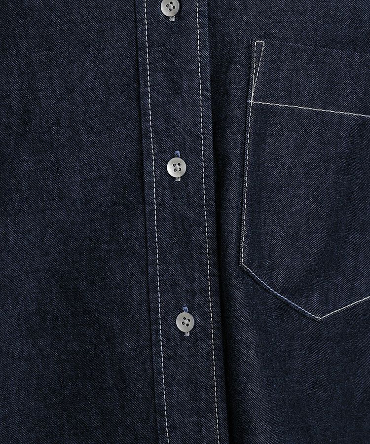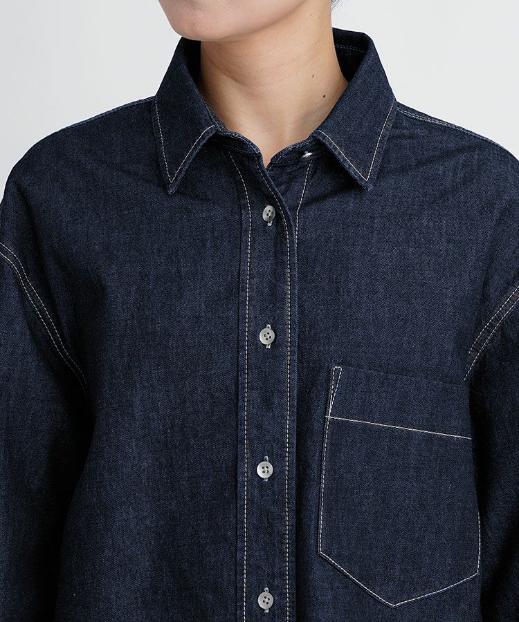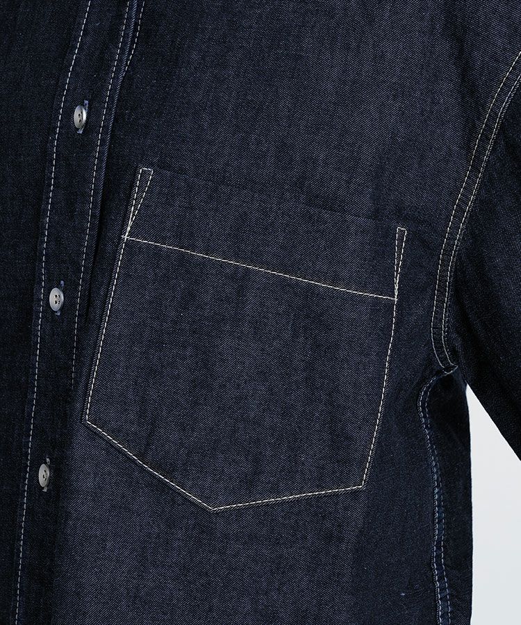 「リジット風の濃色が続く」かつ「柔らかい」を両立させた生地。たて糸が反応染めなので、色落ちしにくくなっています。生地は薄く軽く、柔らかさのあるしなやかな風合いです。色落ちしにくい生地ではありますが、濃色のためお洗濯の際は単独洗いをお願いします。
