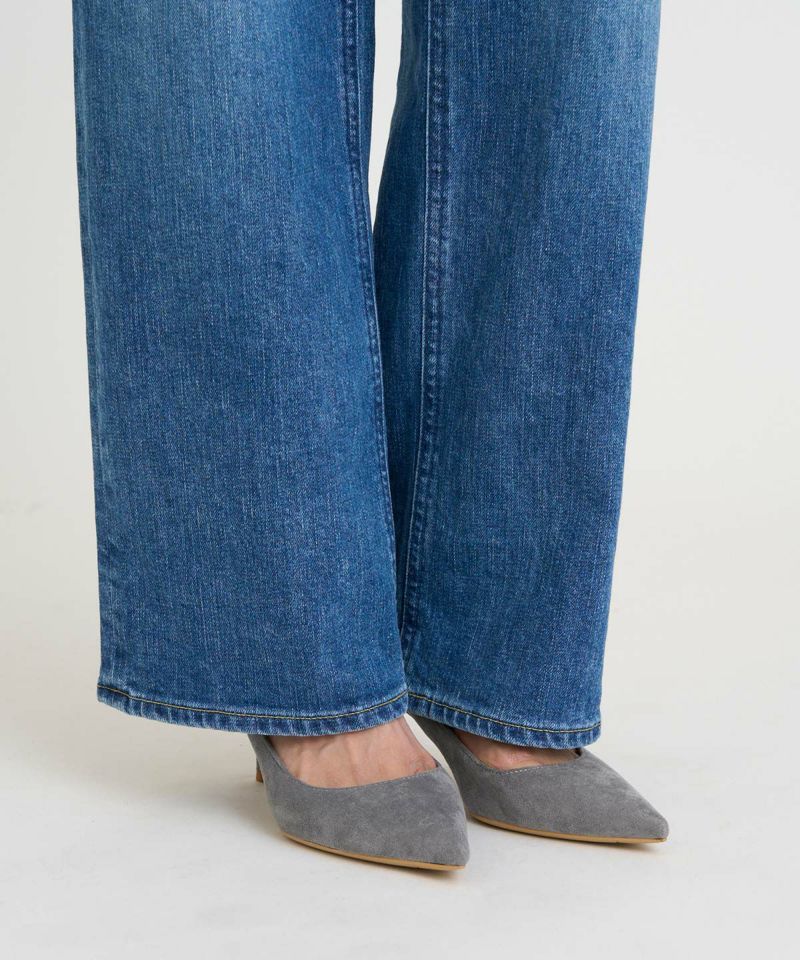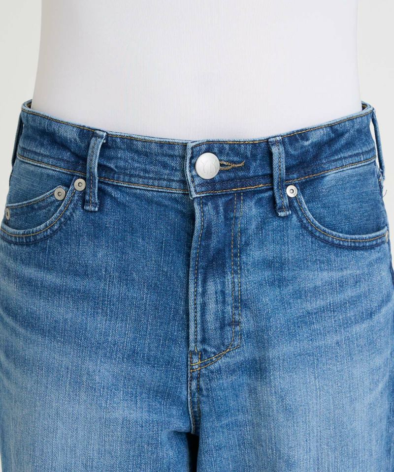 通年穿きやすい中間色ブルー。古着のようなUSED加工を再現しながら、少しかすみがかったような表情感に仕上げることで、様々なコーディネートに合わせやすいカラーになっています。腿にハイライトのスリを入れることで、本格見えながら、脚が細く見えるような加工感にもこだわりました。