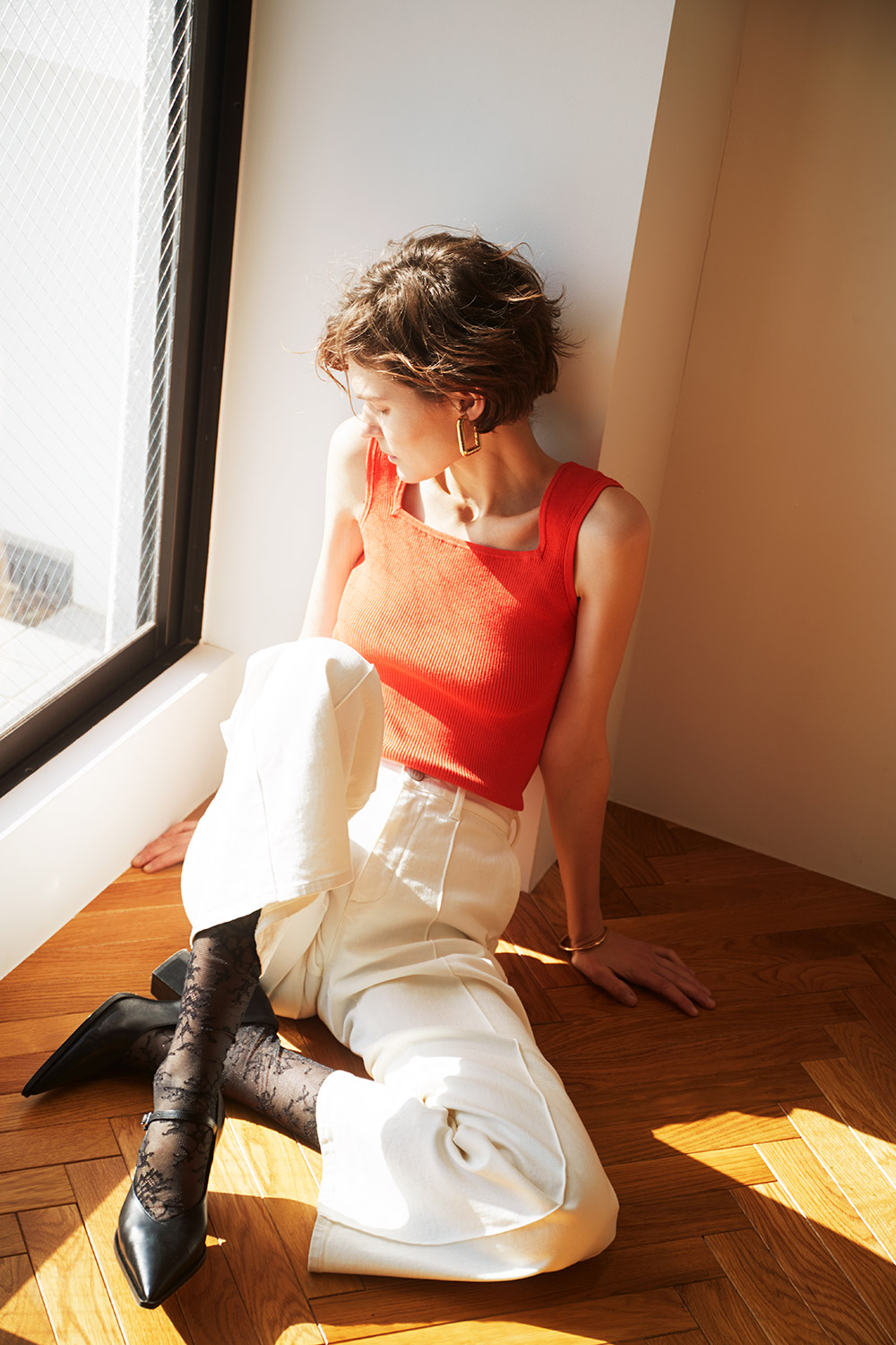 Lace High Socks / 20157163502 BLK / ¥3,080 Pintuck Flare / 57162301 WHS / ¥33,000 Rib Tank Top / 57162907 SCL / ¥16,500