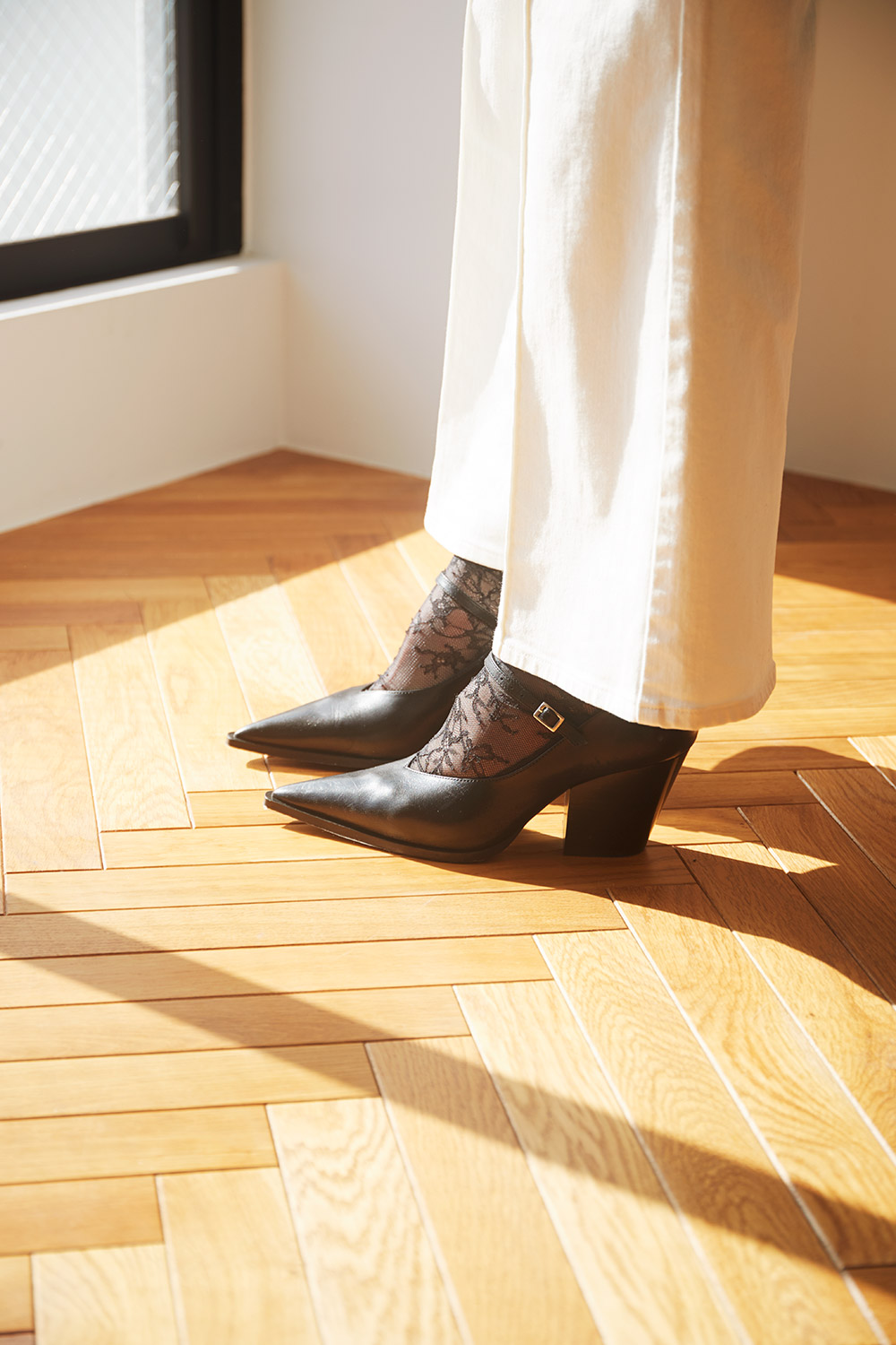 レースソックスはシアーで女らしい表情も相まって、