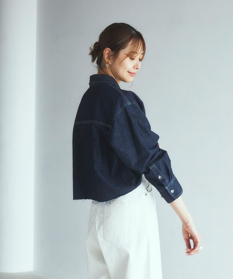 Yanukで人気のクロップドシャツをゆったりとしたフォルムにアップデートしました。秋にかけて暖かい日が続く端境期に、羽織りとしても使えたりと、なにかと重宝するクロップドシャツです。ゆったりとしたフォルムなので、少し寒くなってきたら、中に軽めのニットなども着ることができます。袖口はゆったりしていますが、小さくできるように2段階で調整できるようになっています。小さくすると袖をまくったりもできるようになります。裾は切りっぱなしのデザインで、カジュアルさと抜け感のあるデザインとなっています。