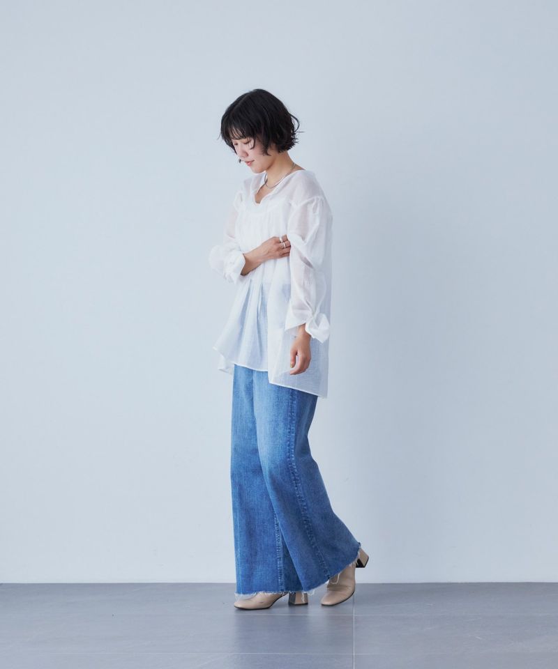 股下が2cm長くなりました。ボリュームがあるシルエットながら、全体的に大きくはせず、腰回りをフィットさせ、裾にかけてゆったり広がっているフレアシルエット。下半身にボリュームをもたせたいときにもオススメで、だらしなくならず、バランスよく上品に穿けるシルエットです。長めのレングスなのでヒールなども相性が良く、スタイルUPも狙えるシルエットです。