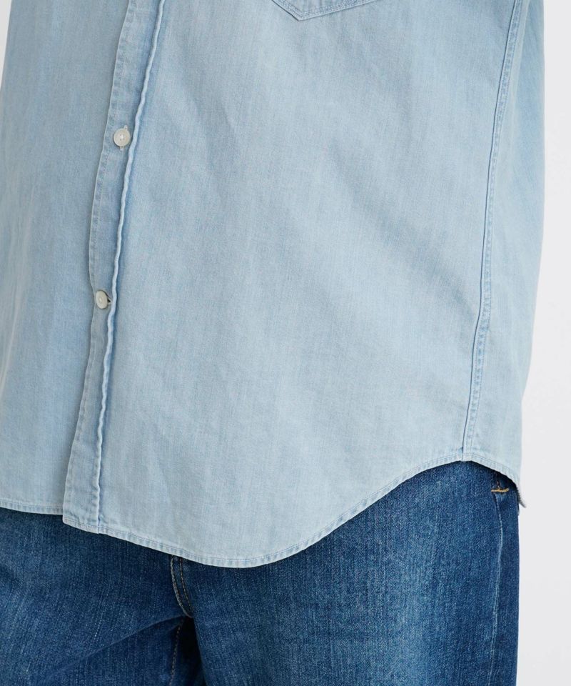 夏の定番シャツの一つバンドカラーシャツで、70年代の雰囲気の強い淡色デニムを採用しました。定番のイメージのあるデニムシャツを淡色USED加工で作ることでレトロ感を感じさせる夏のデニムシャツに仕上げました。ステッチやボタン、Y刺繍をホワイトにすることで、より涼し気な印象になっています。