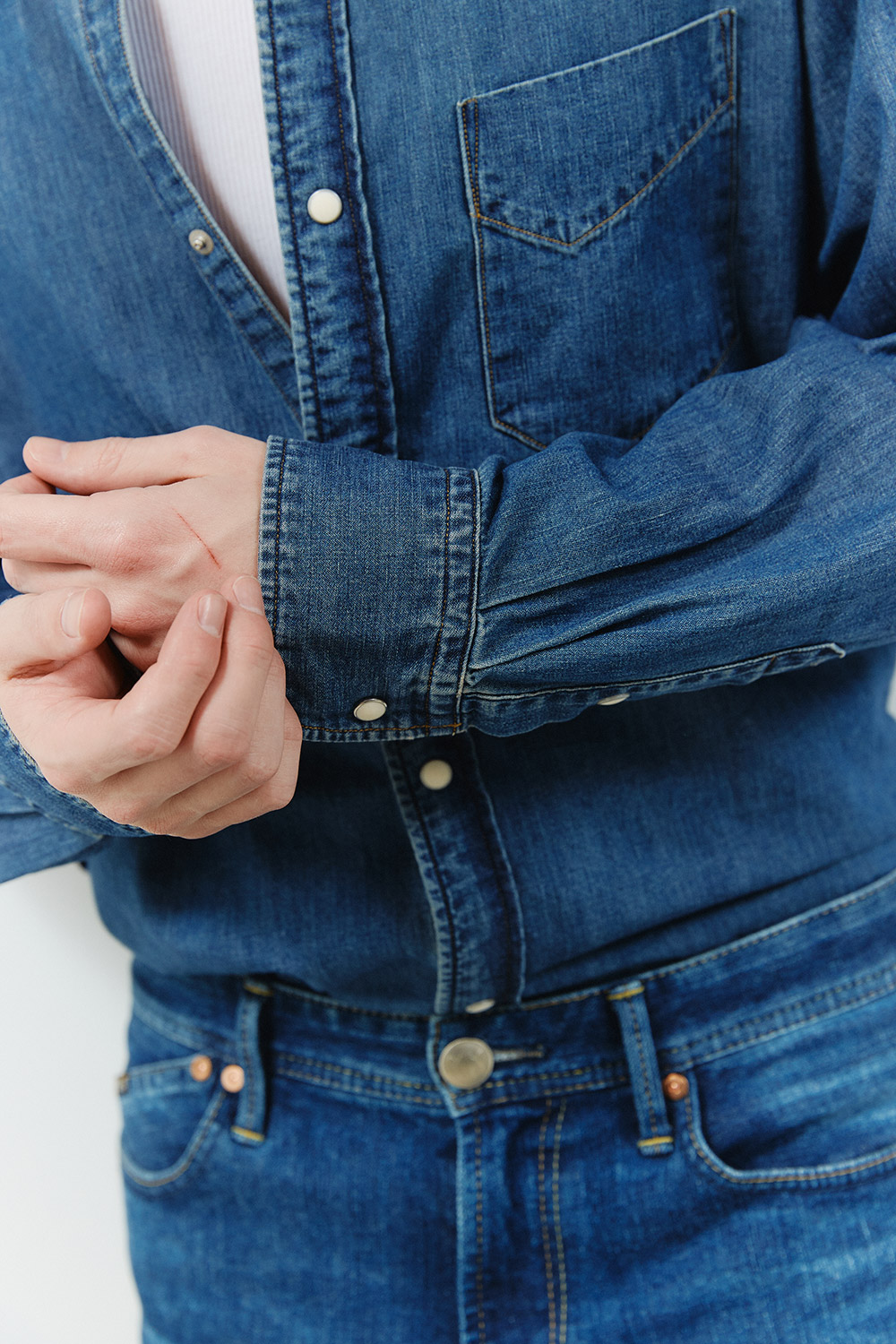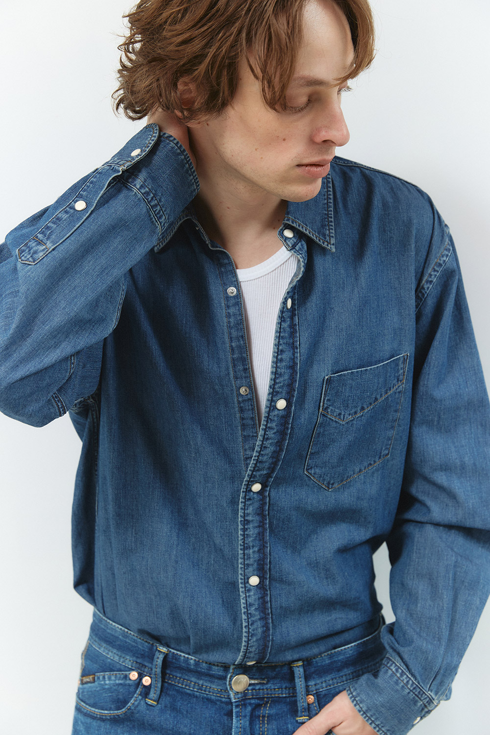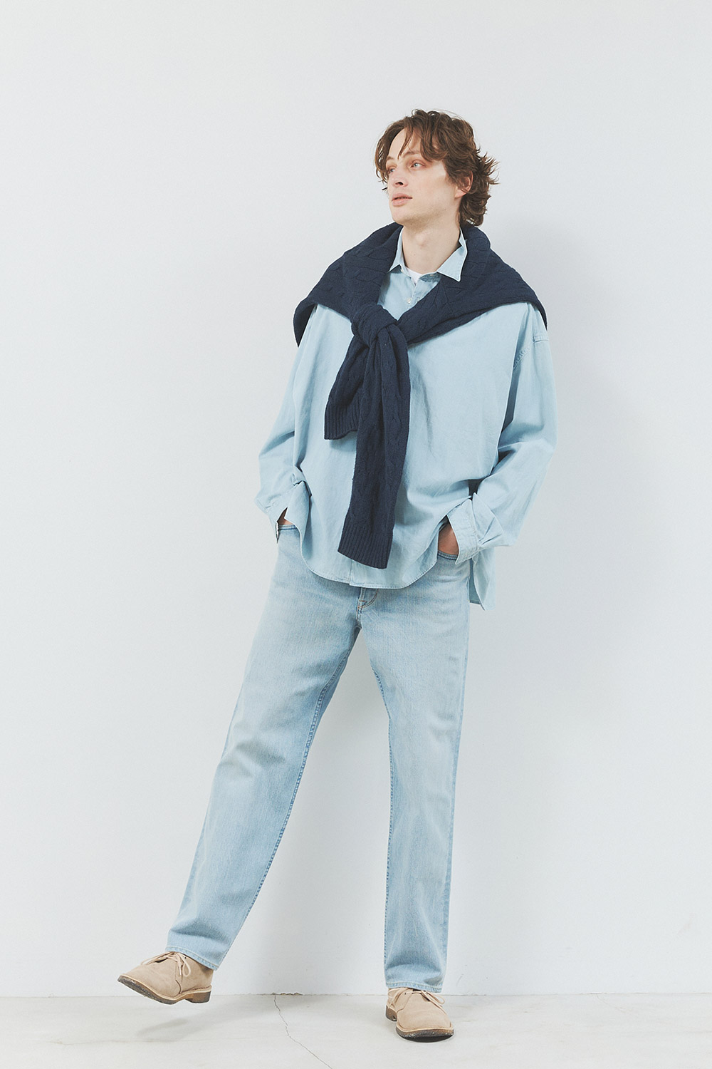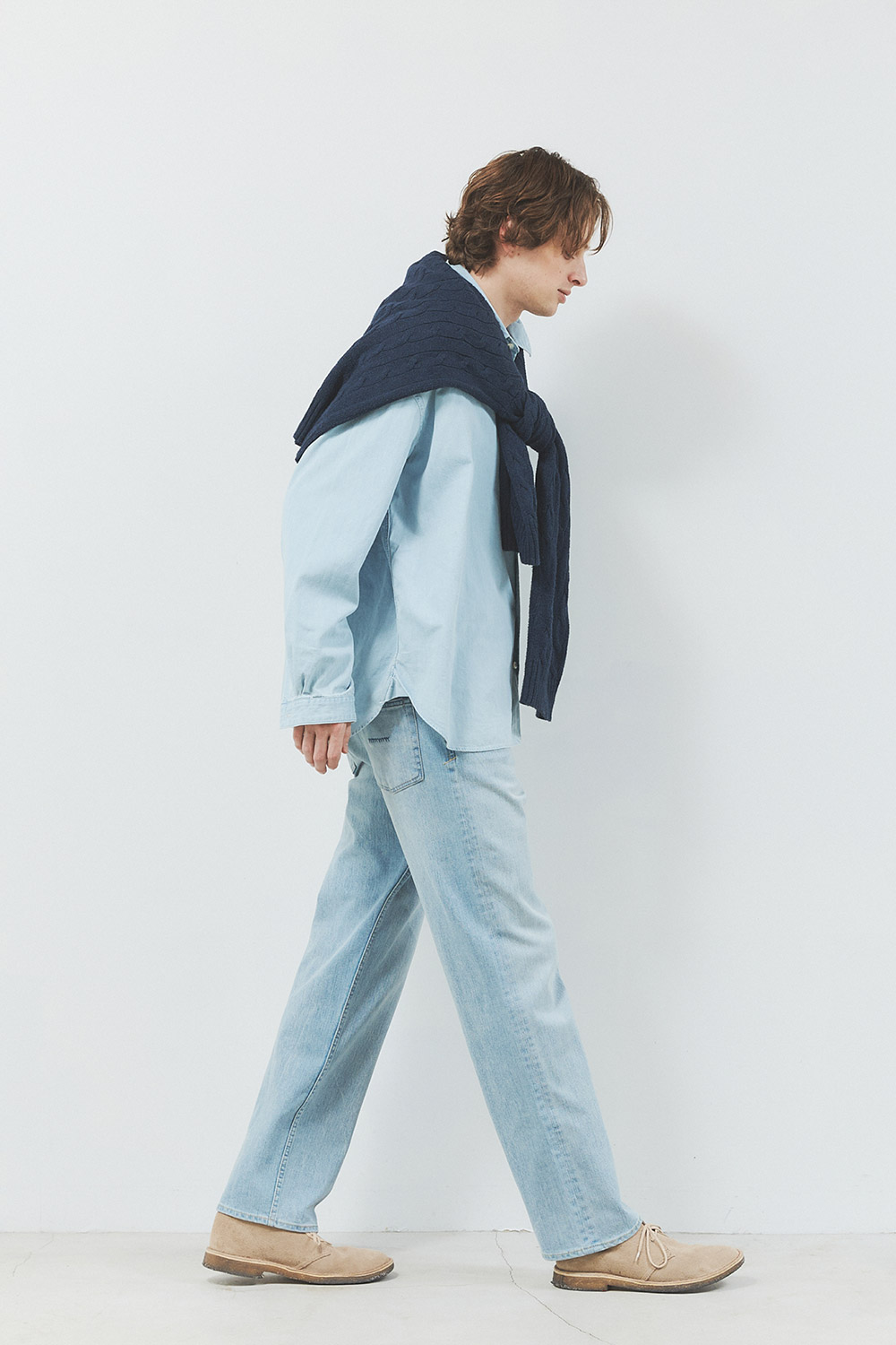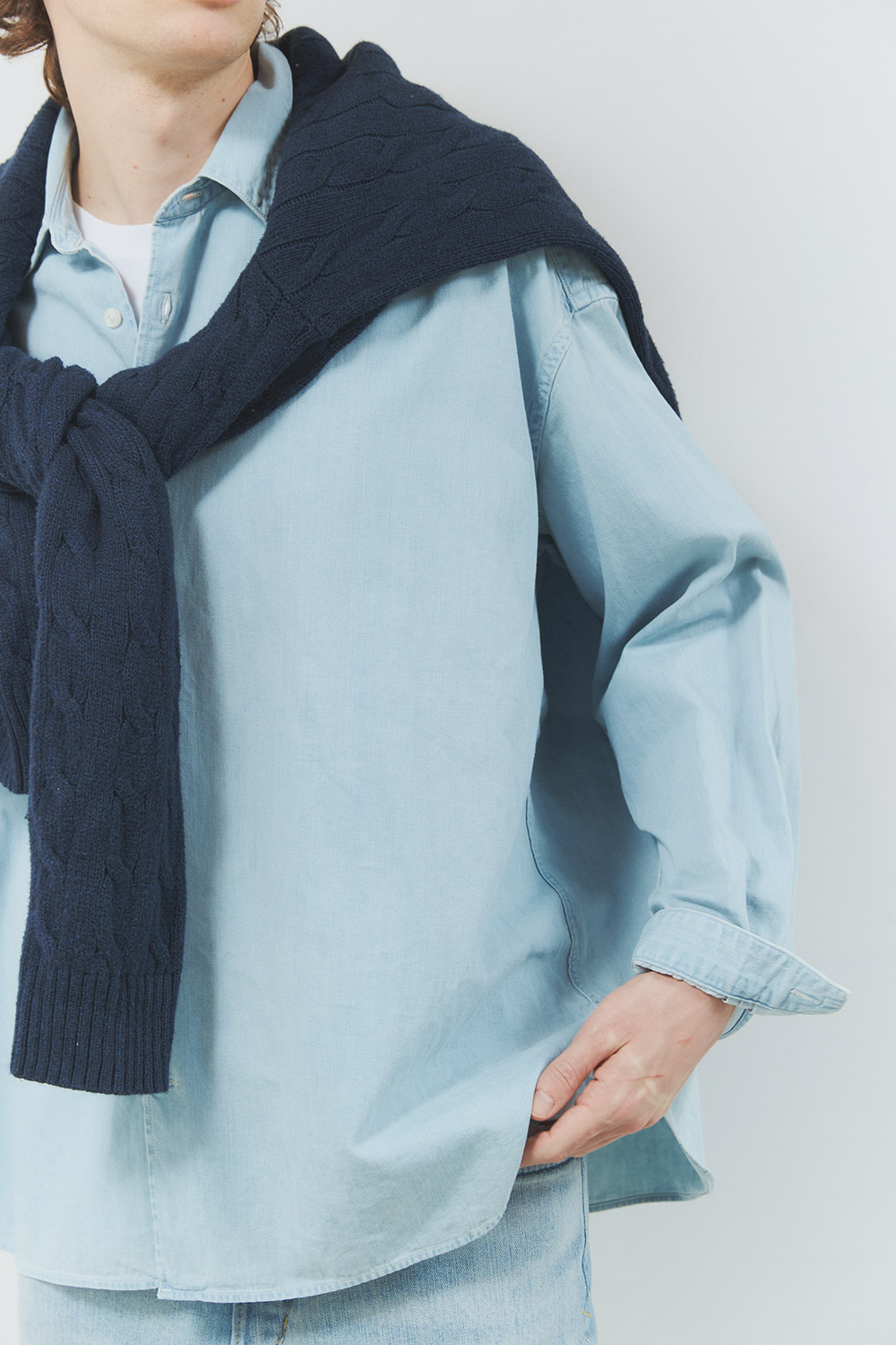 キレイにフェードをかけた淡色デニムシャツをトップスにオン。