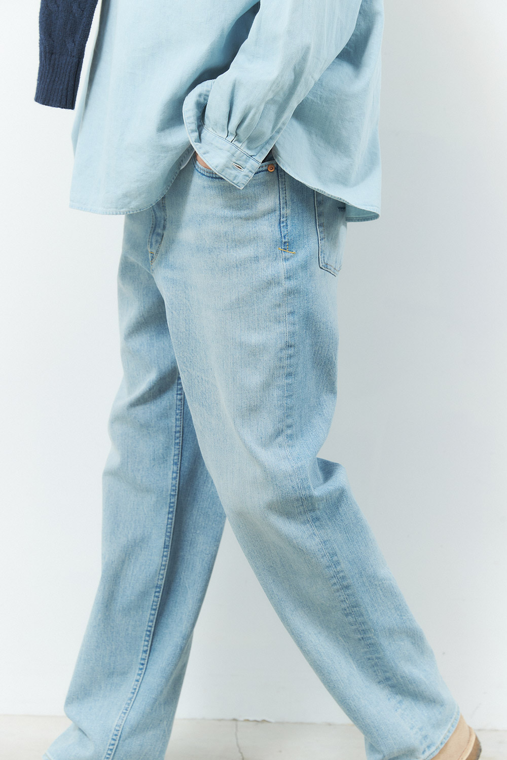 トップスには次なるトレンドとして注目されるデニムシャツを持ってきたトーン・オン・トーンスタイル。