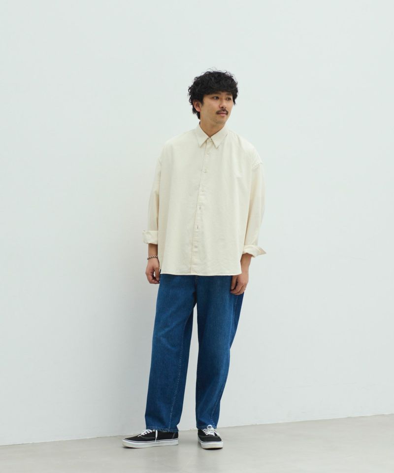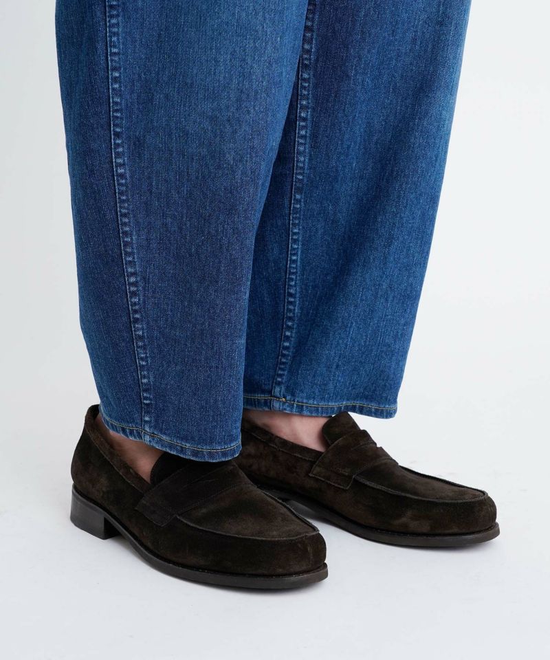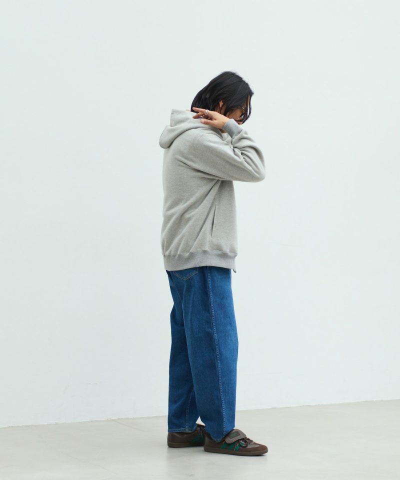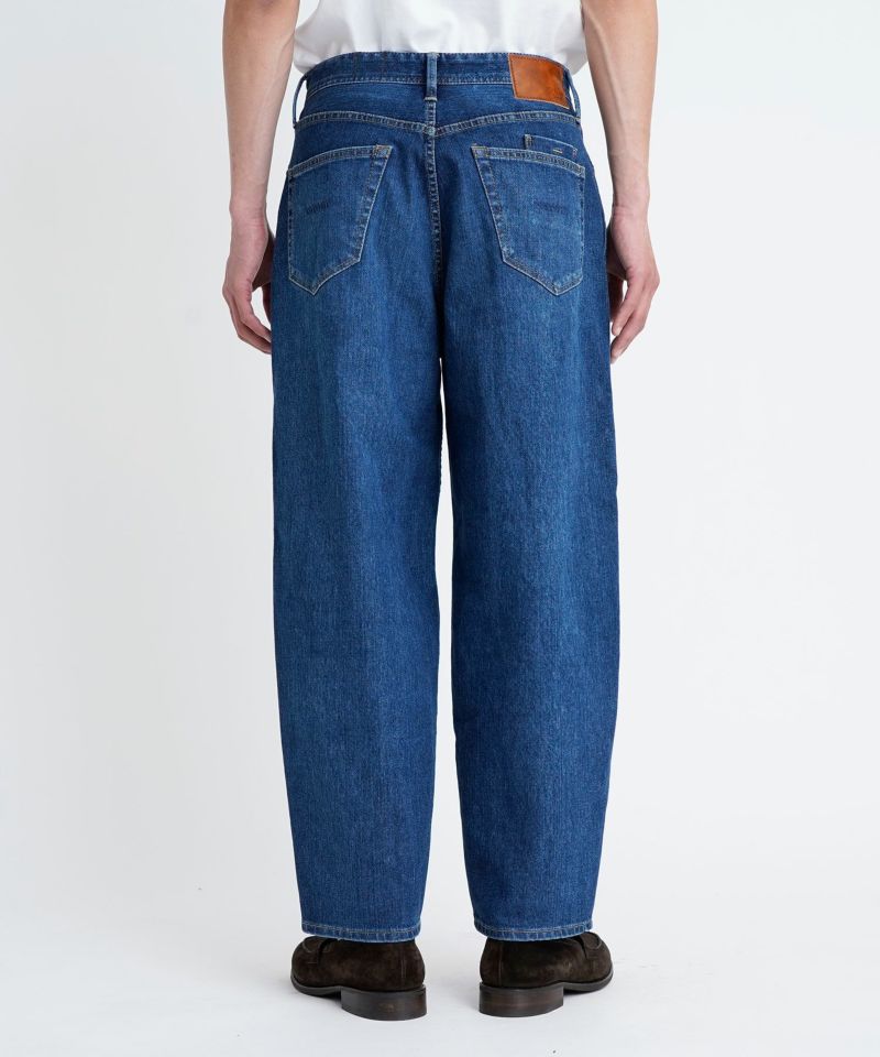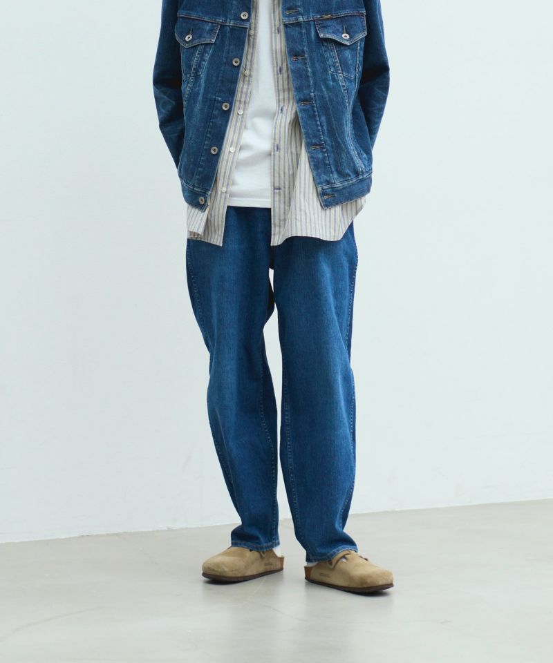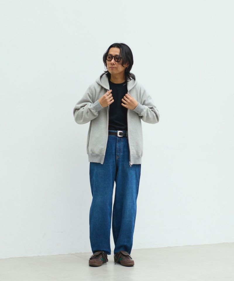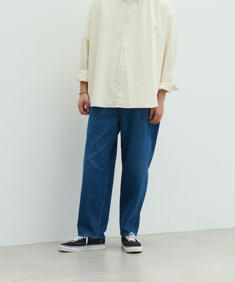 上品見えするフラットな印象のUSED加工。ほんのりモモ擦りも入ったエイジング加工も施しているので、癖が少なく合わせ易い印象。シルエットに特徴があるので、その分色目では人を選ばない広い守備力の加工を採用。