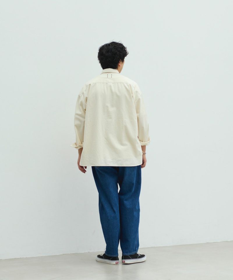 ダーツ等は使用せず、脇側と内股とでアウトカーブを描いたバルーン型のルーズテーパード”BARNY(バーニー)”。全体的にしっかりとゆとりをもたせたルーズシルエットでありながら極限まで絞り込んだ裾が様々な靴との親和性を高めてくれる汎用性の高いシルエットです。あえて巻き縫いを採用し、縫い代で張りを持たせることで生まれる立体感がより印象的なフォルムを際立てます。