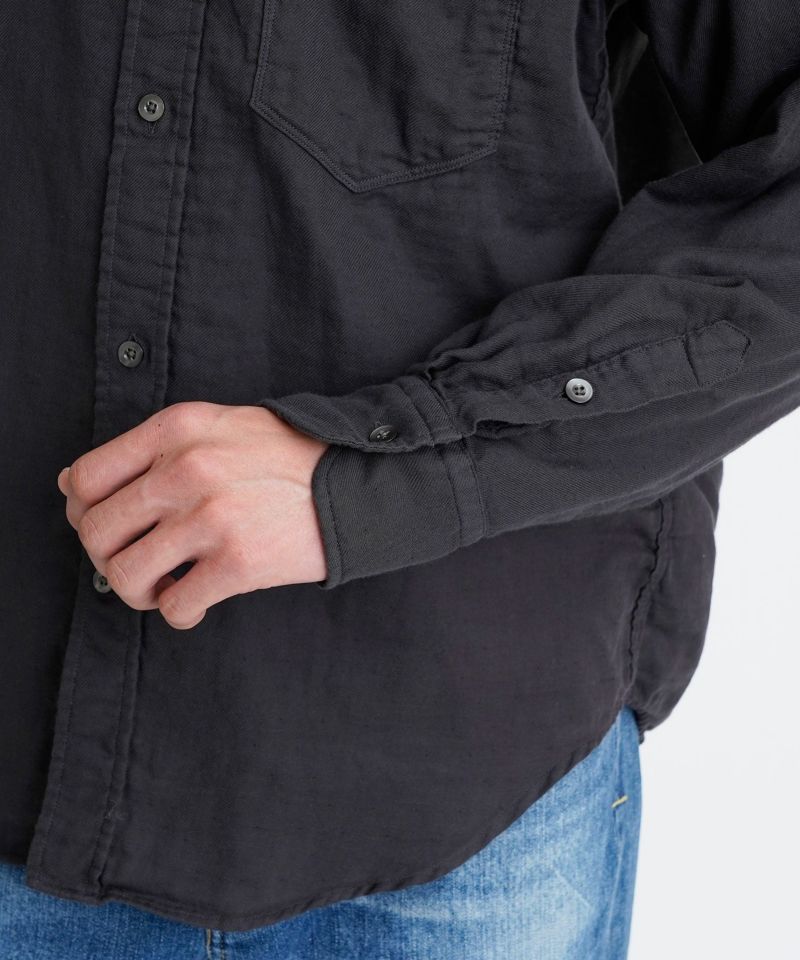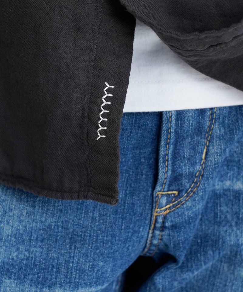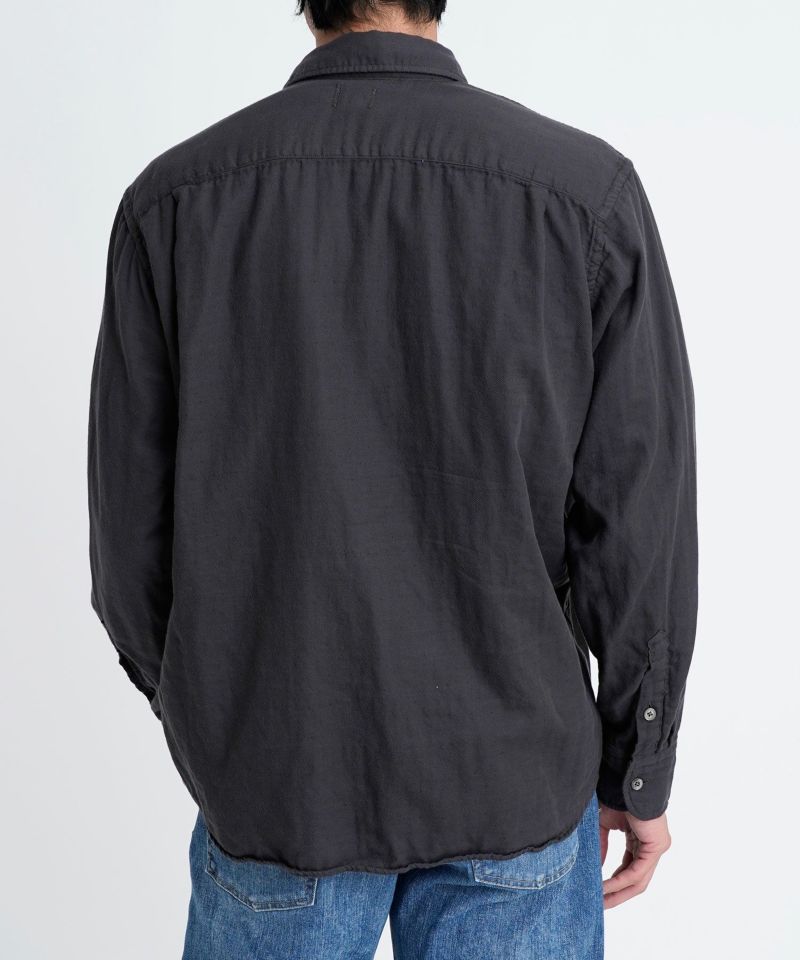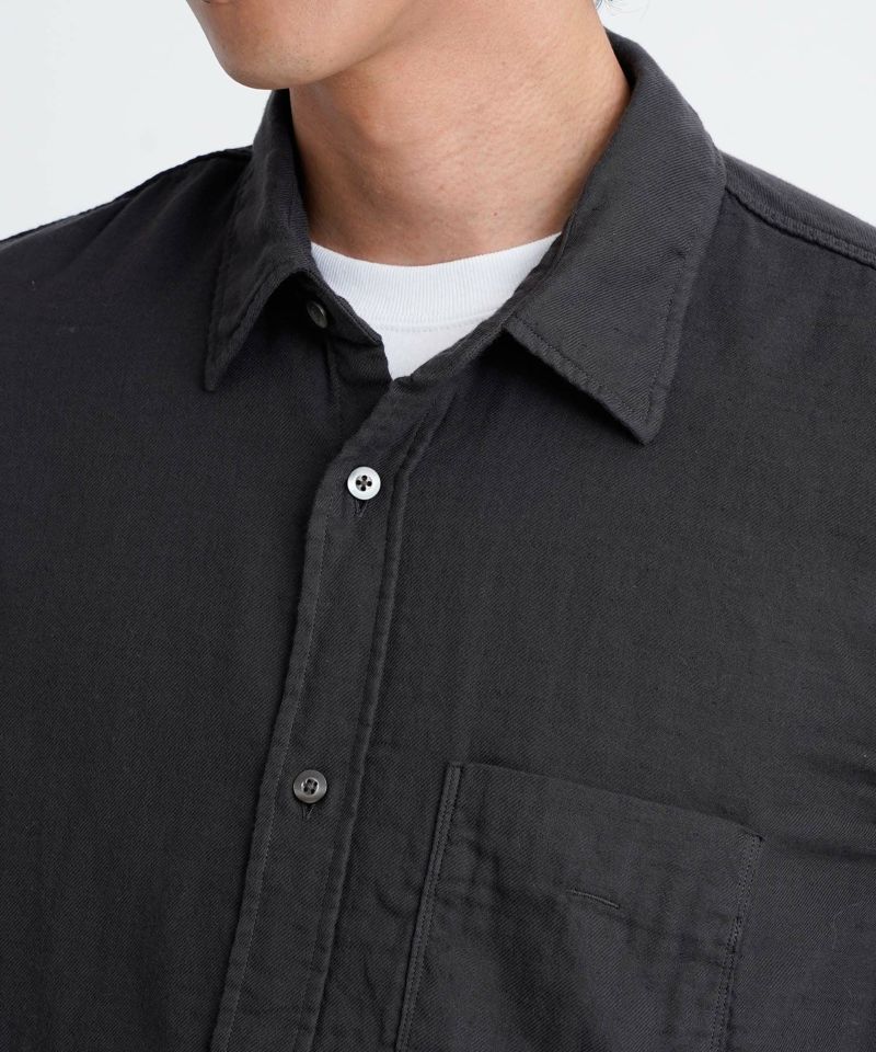 トップスでは最も長い歴を持つシグネチャーアイテムの1つであるダブルガーゼシャツをリニューアル。今の時代にあった「普通なのに、なんかカッコ良い」シルエットに作り変えました。昨今のビッグシルエットの流れに合せ、ユルッと脱力感のある着方が出来る様に身巾を持たせ、肩も少しドロップする様にしています。ボクシーでありながらも若干裾が細い逆三角的なフォルムに仕上げつつ、着丈はジーンズと相性の良いジャスト丈をキープしています。