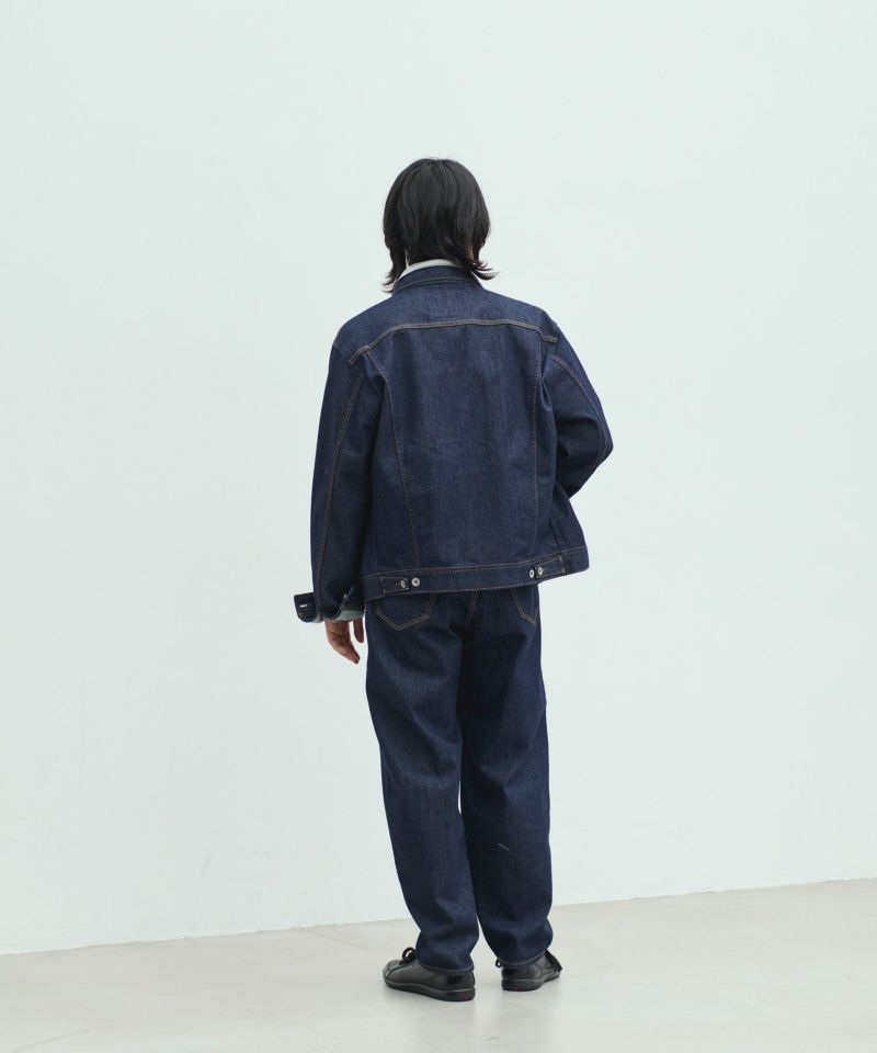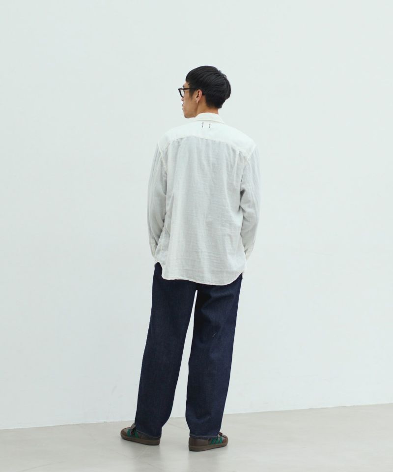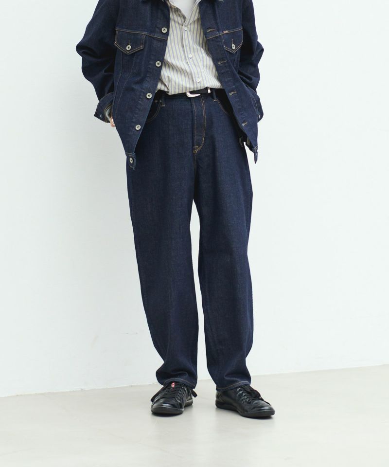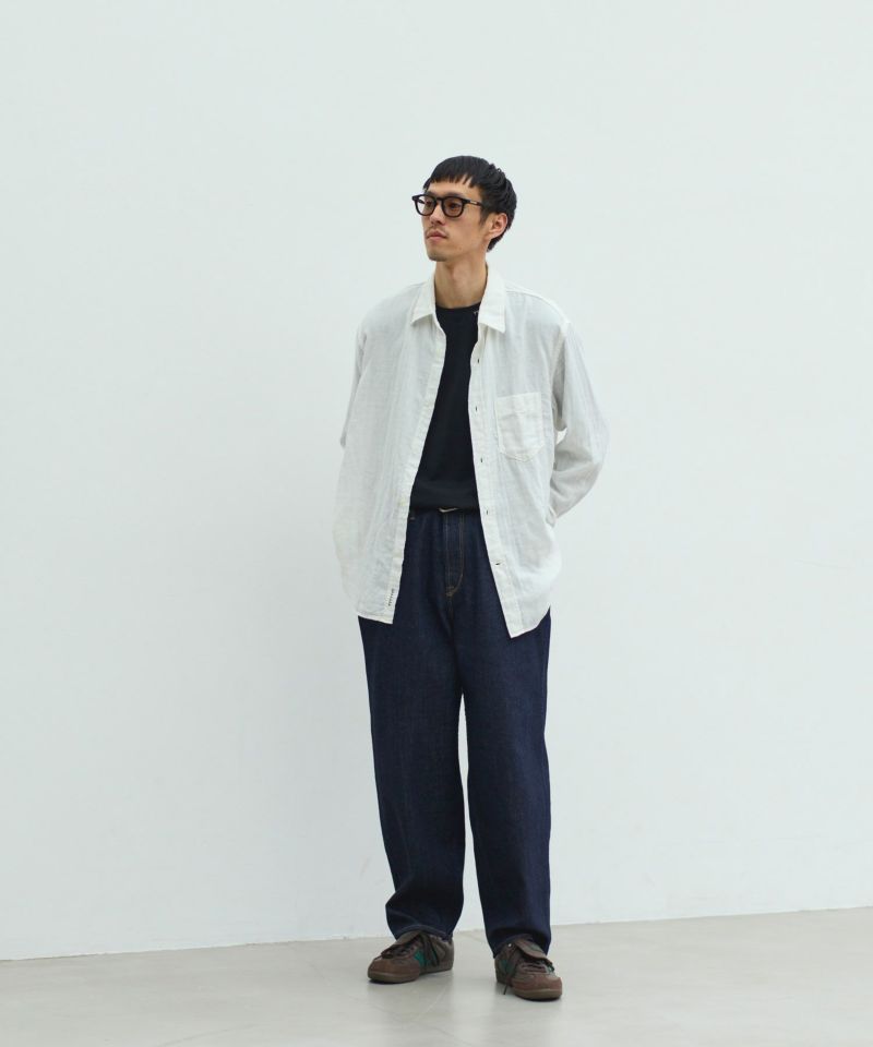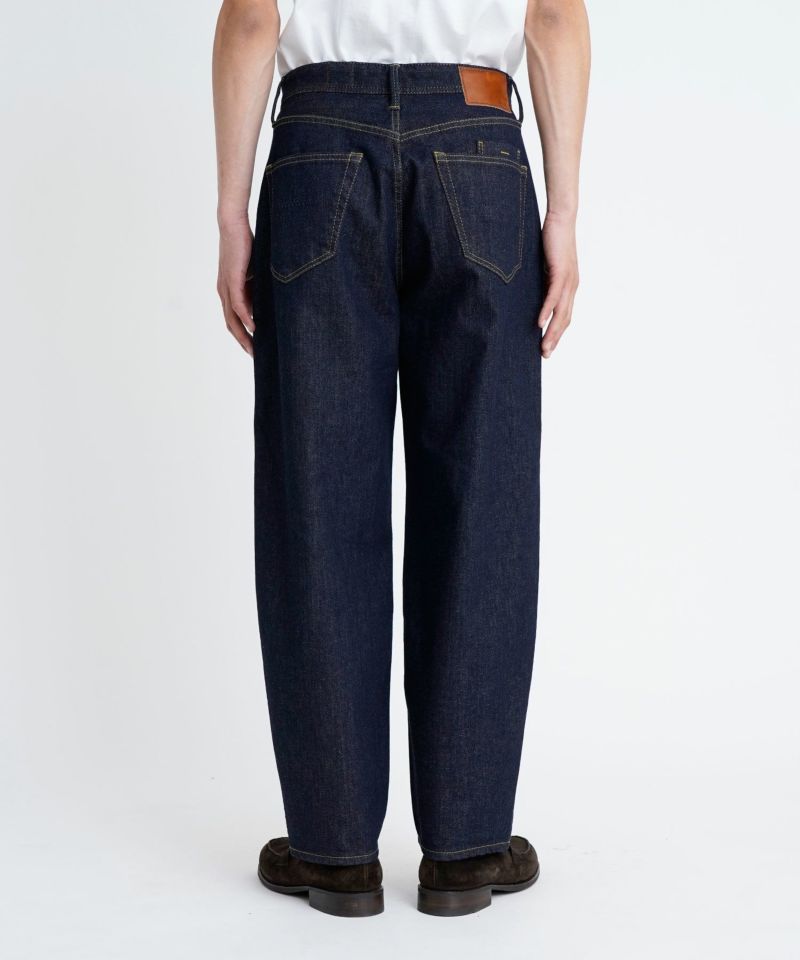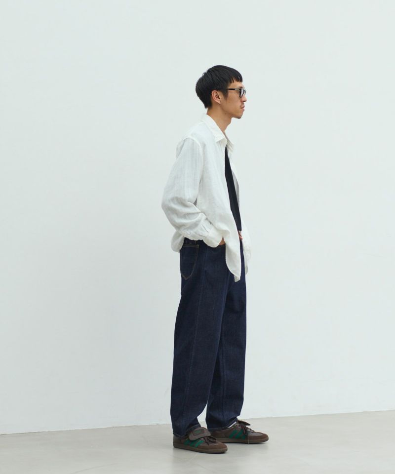ダーツ等は使用せず、脇側と内股とでアウトカーブを描いたバルーン型のルーズテーパード”BARNY(バーニー)”。全体的にしっかりとゆとりをもたせたルーズシルエットでありながら極限まで絞り込んだ裾が様々な靴との親和性を高めてくれる汎用性の高いシルエットです。あえて巻き縫いを採用し、縫い代で張りを持たせることで生まれる立体感がより印象的なフォルムを際立てます。