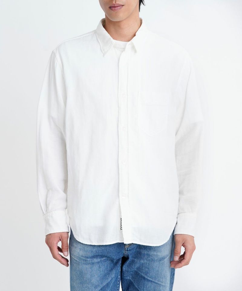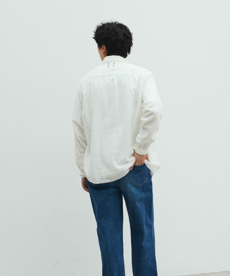 トップスでは最も長い歴を持つシグネチャーアイテムの1つであるダブルガーゼシャツをリニューアル。今の時代にあった「普通なのに、なんかカッコ良い」シルエットに作り変えました。昨今のビッグシルエットの流れに合せ、ユルッと脱力感のある着方が出来る様に身巾を持たせ、肩も少しドロップする様にしています。ボクシーでありながらも若干裾が細い逆三角的なフォルムに仕上げつつ、着丈はジーンズと相性の良いジャスト丈をキープしています。