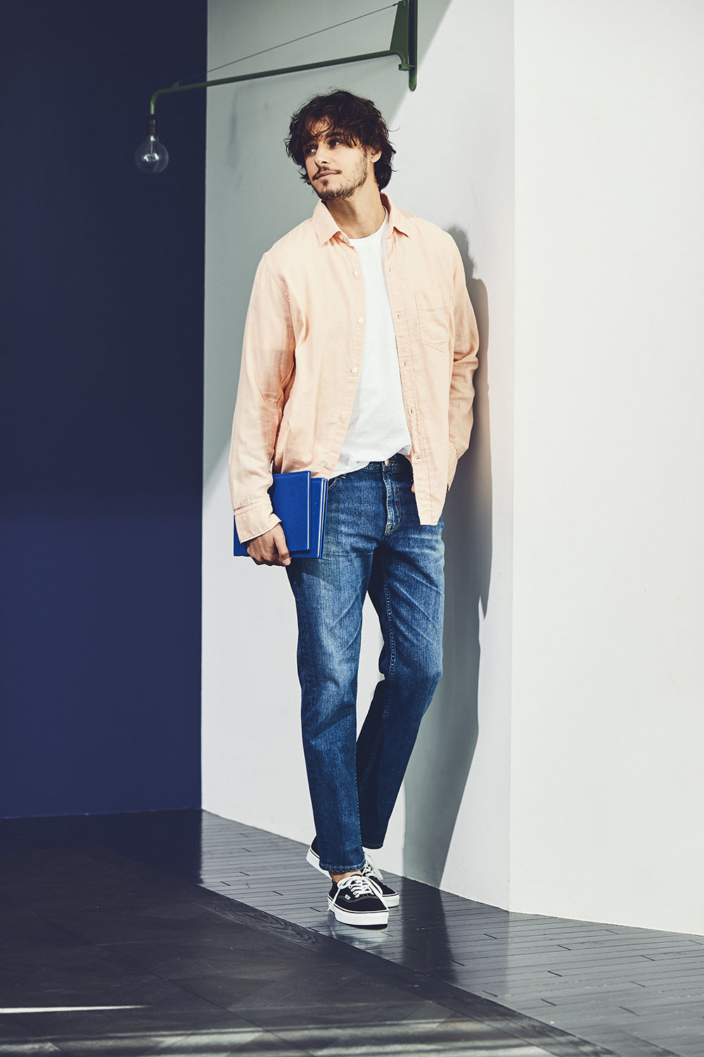”キレイな印象で穿けるデニムパンツ”を目指した”MICHEL“もアップデートを重ねて理想のシルエットに着地。 写真のようにシャツをアウトしても、タ ックインして着ても上品さを維持しつつバランス良くまとまる。ペールトーンの柔和なシャツの印象で、 デニムのブルーも一層映える。