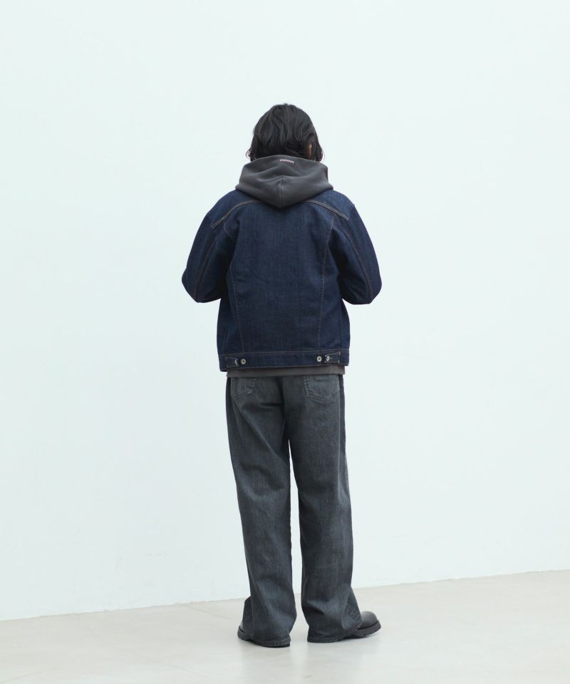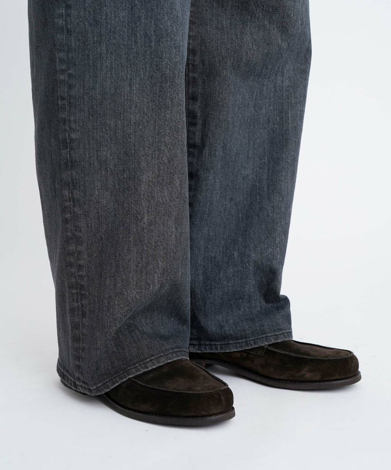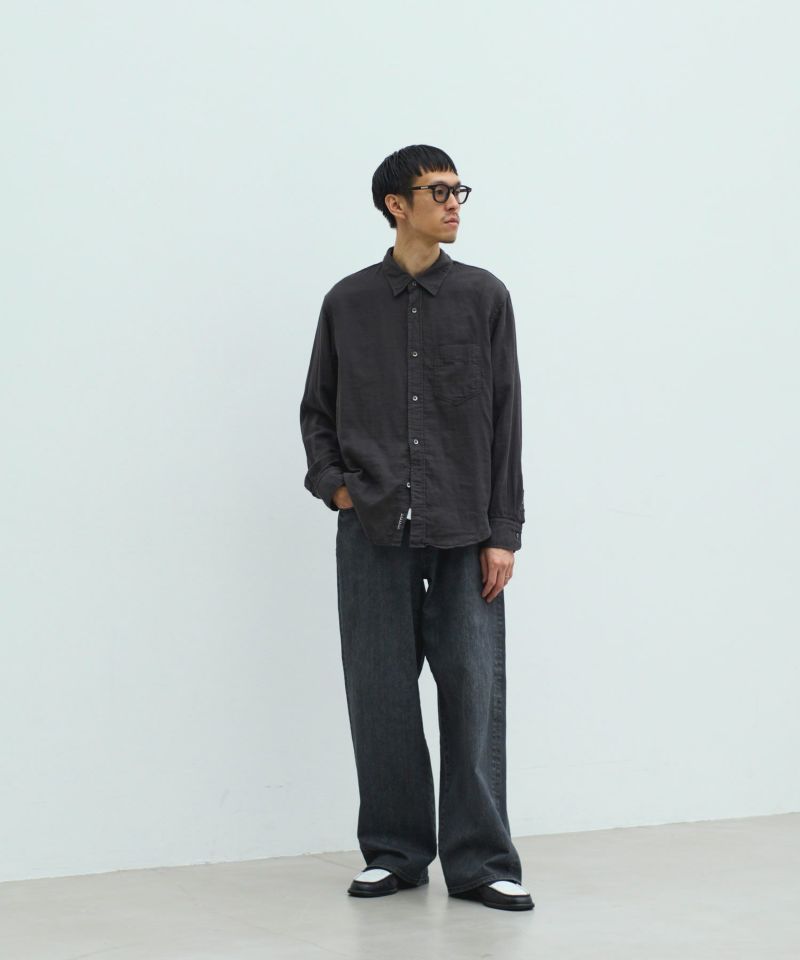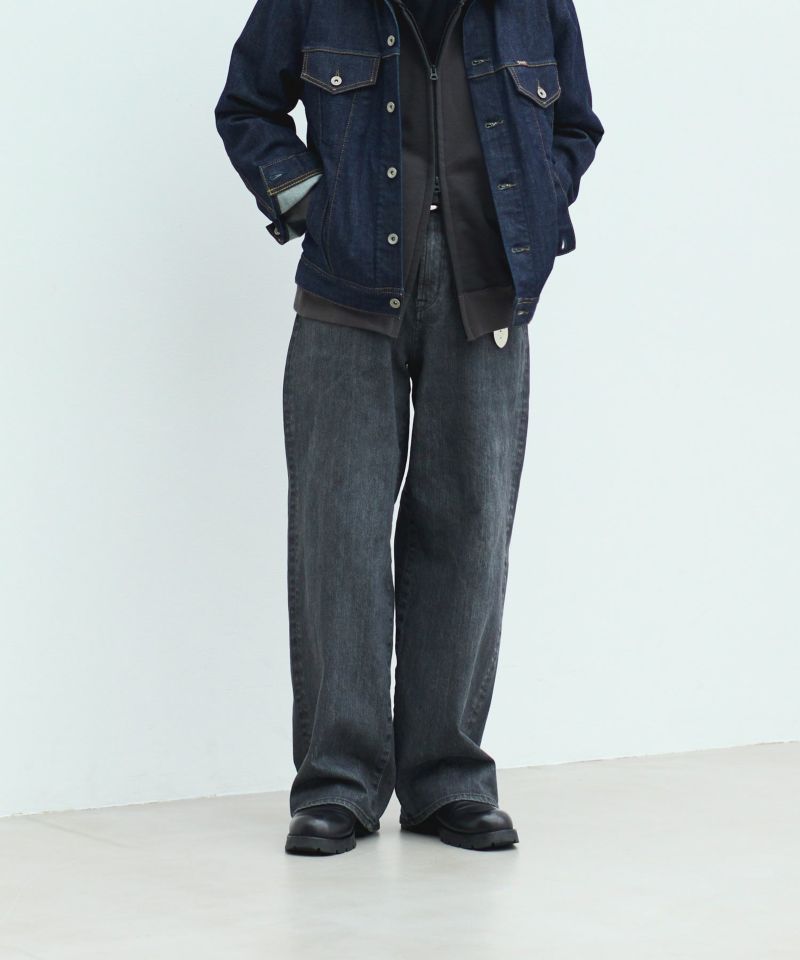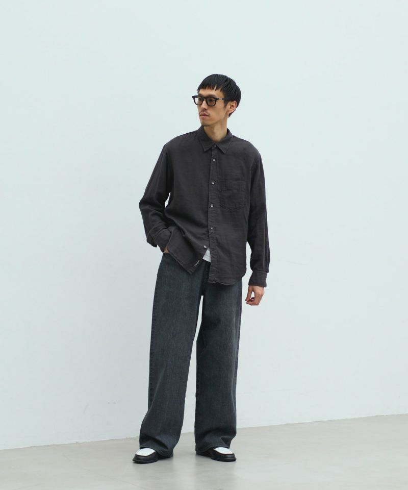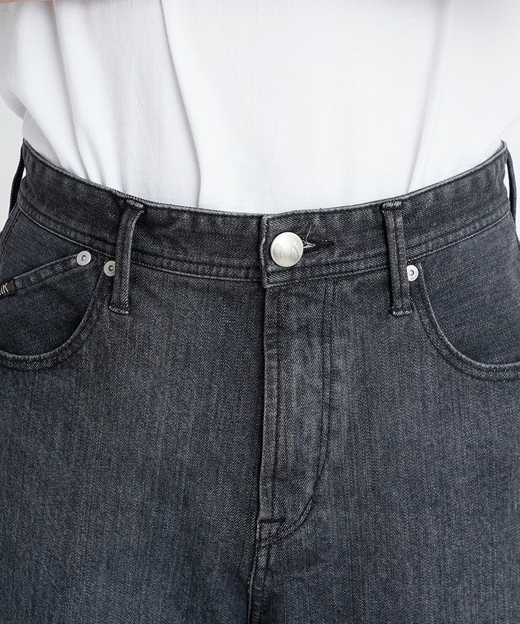 90年代のブラックジーンズをサンプリングし、ヒゲや擦りとは異なる、生地の凹凸感やシボ感等で生まれた表情をレーザーで再現。USED加工とは一味違うカラー感覚の90’sの雰囲気がシルエットとマッチしている一本です。