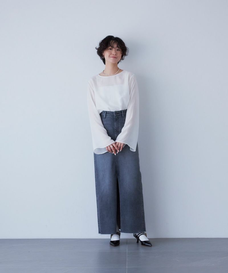 Iラインシルエットのロングスカート。腰回りがフィットしていて、裾に向かって真っすぐ落ちるすっきりとしたシルエットです。前スリットがポイントで、抜け感を演出しつつ足さばきしやすく、大人な印象を与えてくれます。腰回りがスッキリとしていて丈が長めなので縦のラインを強調し、脚長効果が期待できます。クロップド丈のトップスとも相性がよく、バランスよく合わせられます。ウエストの位置をミドルウエストで合わせてもらうとこなれ感がでて、今っぽく穿いていただけます。