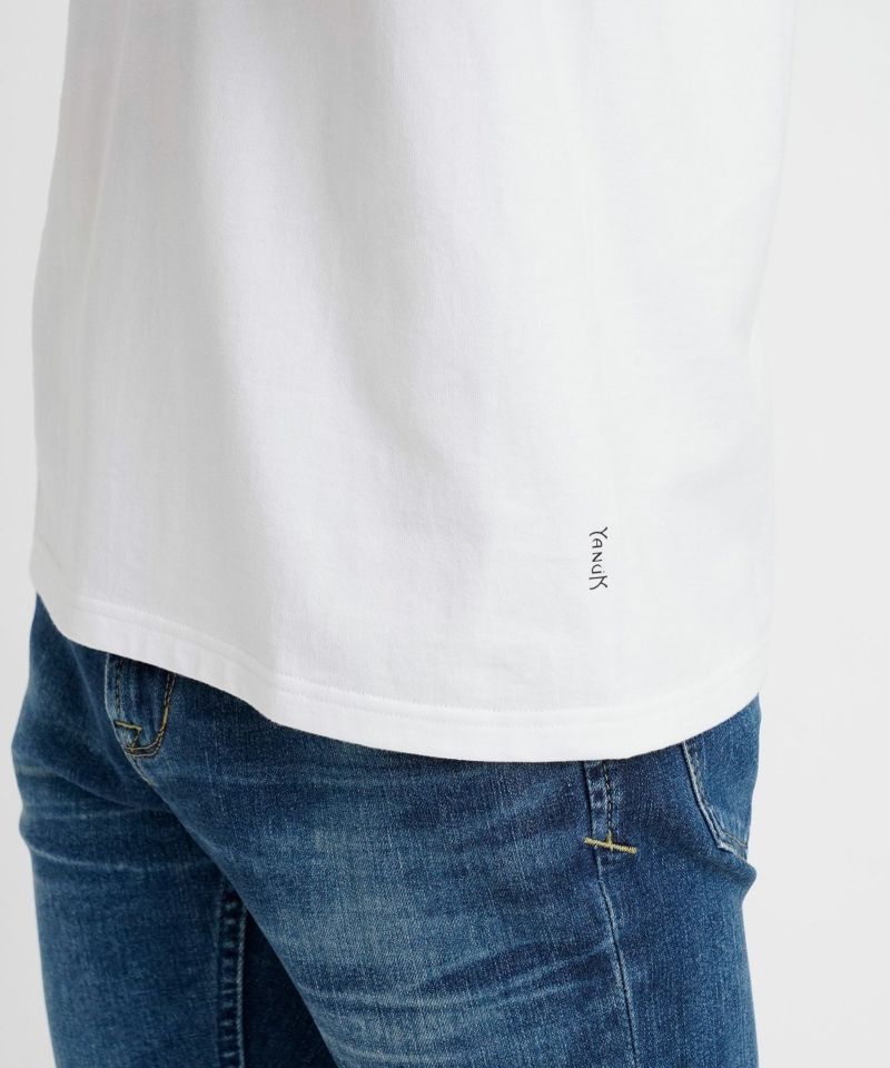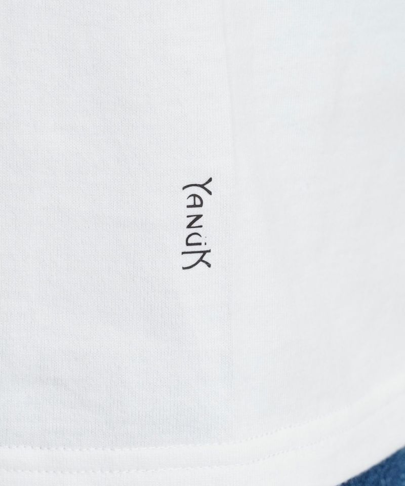 胸元のポケットとロゴがポイントの、ユニセックスで着られるTシャツです。国内紡績でキレイに仕上げた甘撚りの30番糸に双糸加工を施し、度甘に編み上げる事で、地厚なのにふっくら柔らかい絶妙の風合いを持つ天竺に仕上げました。古いタイプのシンカー小寸編み機を用いた事でゆっくり編むことができ、糸のループ目がきれいになりキックバックがいい天竺を生み出しています。着用時にネームや品質表示が肌に当たらないタグレス仕様で、敏感肌のかたでも心地よく着て頂けるのが特徴。丸胴で編んでいる為、脇がシームレスでシェイプの無いオーセンティックなBOXシルエットに。袖丈を少し長くし、一枚着でもお洒落に見える様に設定しています。程良いオーバーサイズ感が大人の抜け感を演出する1枚です。