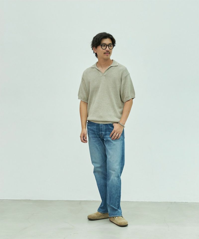 和紙糸を使用した清涼感のあるサマーニット。綿とレーヨンを混ぜた糸を採用しているので、和紙糸でありがちな固い印象の肌触りを解決。YANUKらしくて大人が着られるアイテムとして、90年代のフットボールゲームシャツをイメージしました。カラーにはリゾート感と大人っぽさが色濃く出せるよう落ち着いた色目を採用しました。透け感のあるアイテムなので、インナーにTシャツを重ねて襟の空きからTシャツを覗かせるとよりスタイリッシュな印象に決まります。