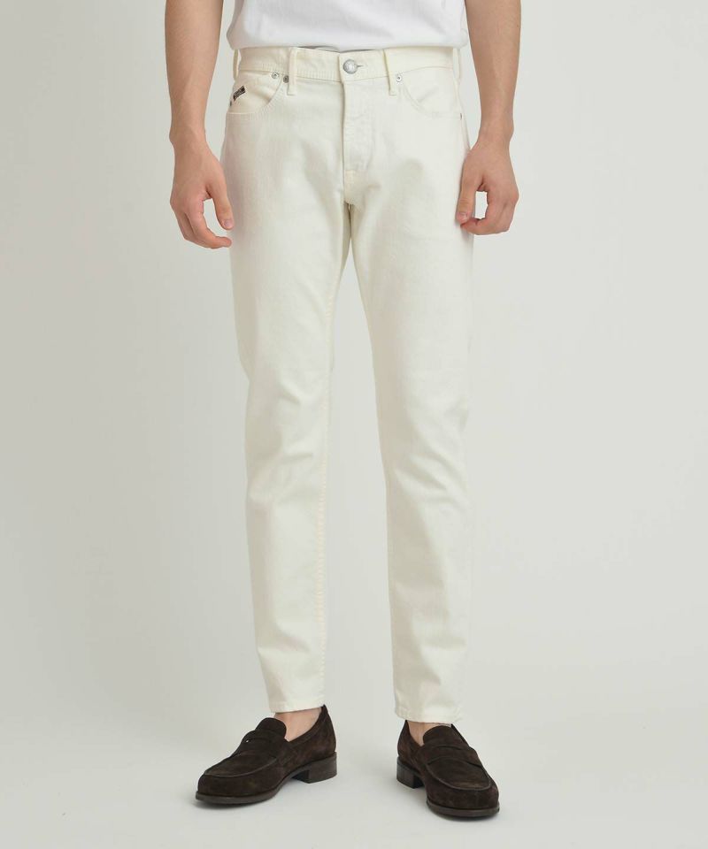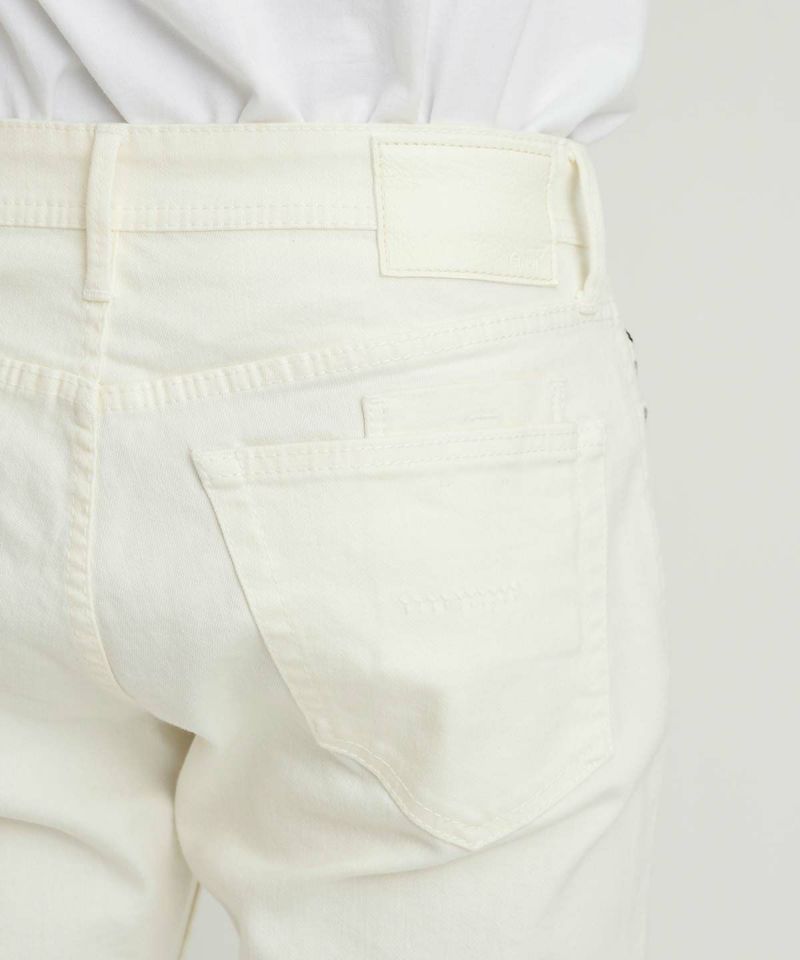 伸びすぎないコンフォートなストレッチ性と、適度な肉感で安心感のある履き心地を実現しました。2種類のムラ糸が適度な表情を出しています。製品加工でスピルプルーフ加工を施し、撥水・撥油・防汚機能を付与。汚れを気にせず穿けるホワイトデニムです。雨の日の泥水汚れも、食べはねも心配は無用です。水は弾きますが湿気は逃がすので、レインコートを着たときの様なじめっと感はありません。もちろんご家庭でのお洗濯も可能で、効果が弱まってきてもドライヤーや乾燥機、アイロンをかければ復活します。顔料をのせていない、生成りのようなナチュラルなホワイトなので、パンツだけ浮いてしまう事なくコーディネートに馴染みます。