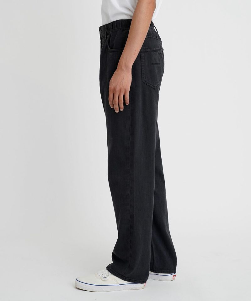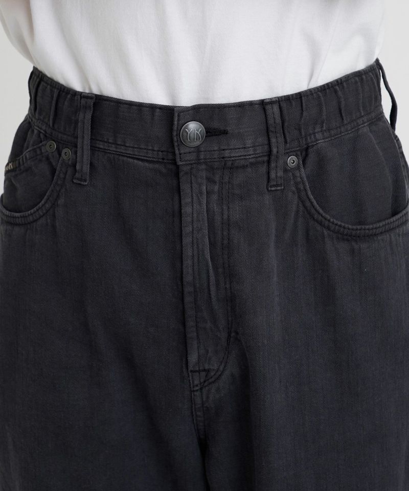 ウエストのゴムには通気性の良いメッシュゴムを採用しています。ポケットにもメッシュスレキを採用し汗をかいても肌にまとわりつかず快適な穿き心地です。ホワイトの革ラベル・ボタンを採用し視覚的にも涼しげな印象を与えてくれます。カラーは、夏にふさわしい黒を表現するために、暑苦しくない黒を追求しました。従来のウォーンブラック(味黒)にさらにエイジングを引っ張ったイメージで作成しました。