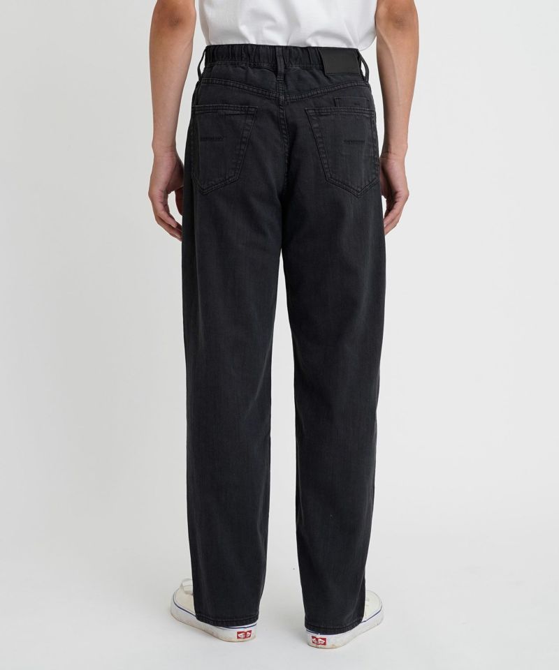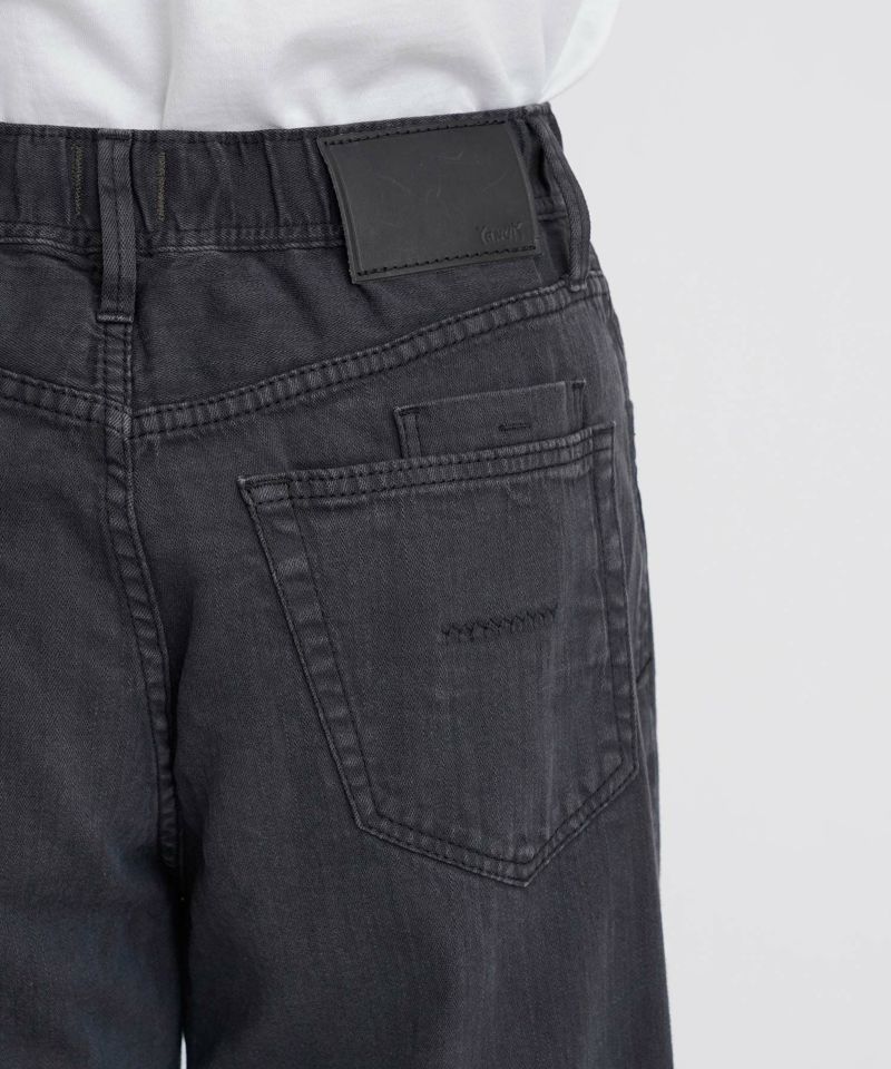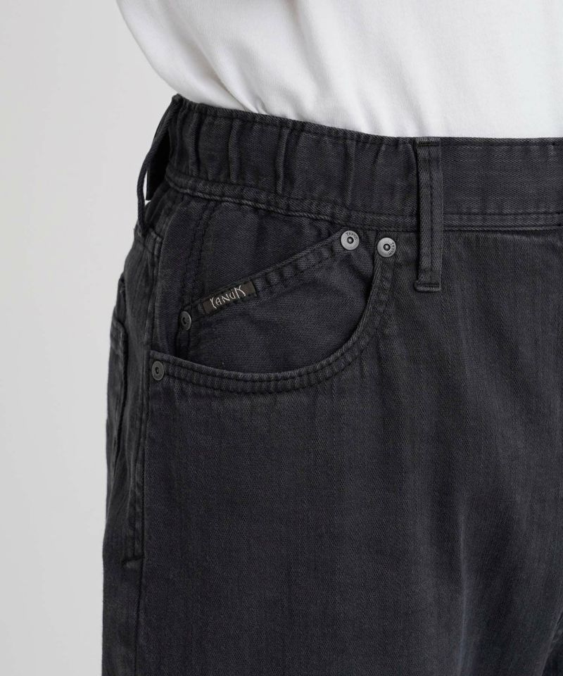 ウエストのゴムには通気性の良いメッシュゴムを採用しています。ポケットにもメッシュスレキを採用し汗をかいても肌にまとわりつかず快適な穿き心地です。ホワイトの革ラベル・ボタンを採用し視覚的にも涼しげな印象を与えてくれます。カラーは、夏にふさわしい黒を表現するために、暑苦しくない黒を追求しました。従来のウォーンブラック(味黒)にさらにエイジングを引っ張ったイメージで作成しました。