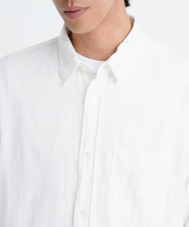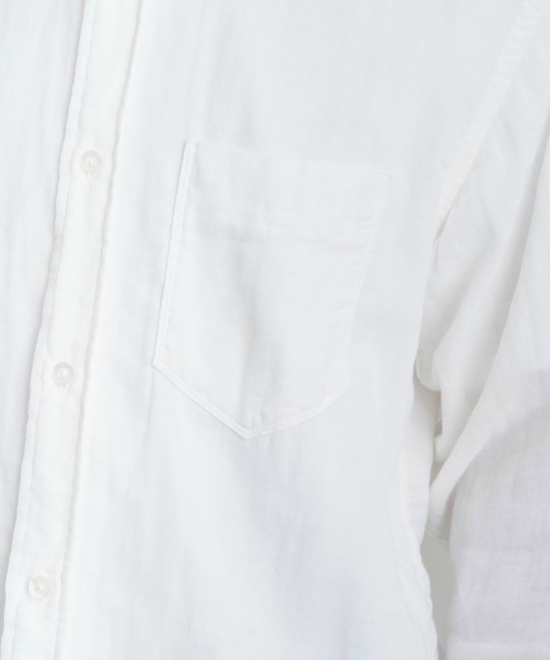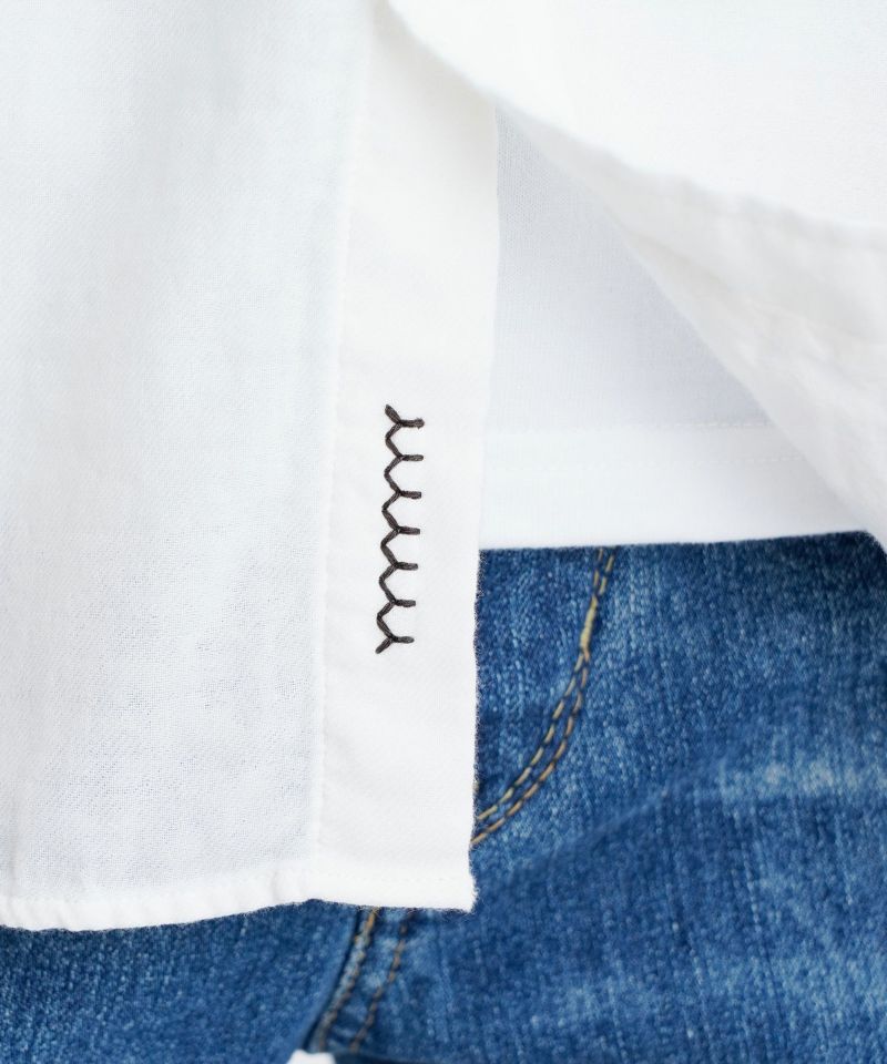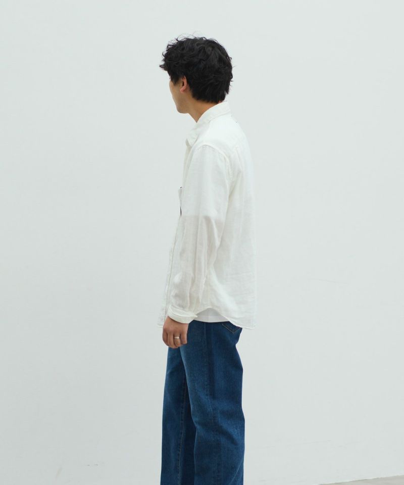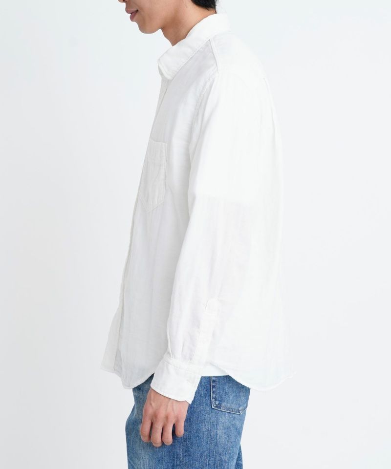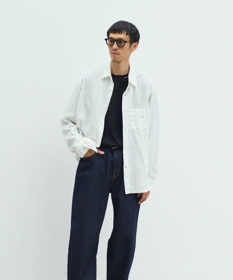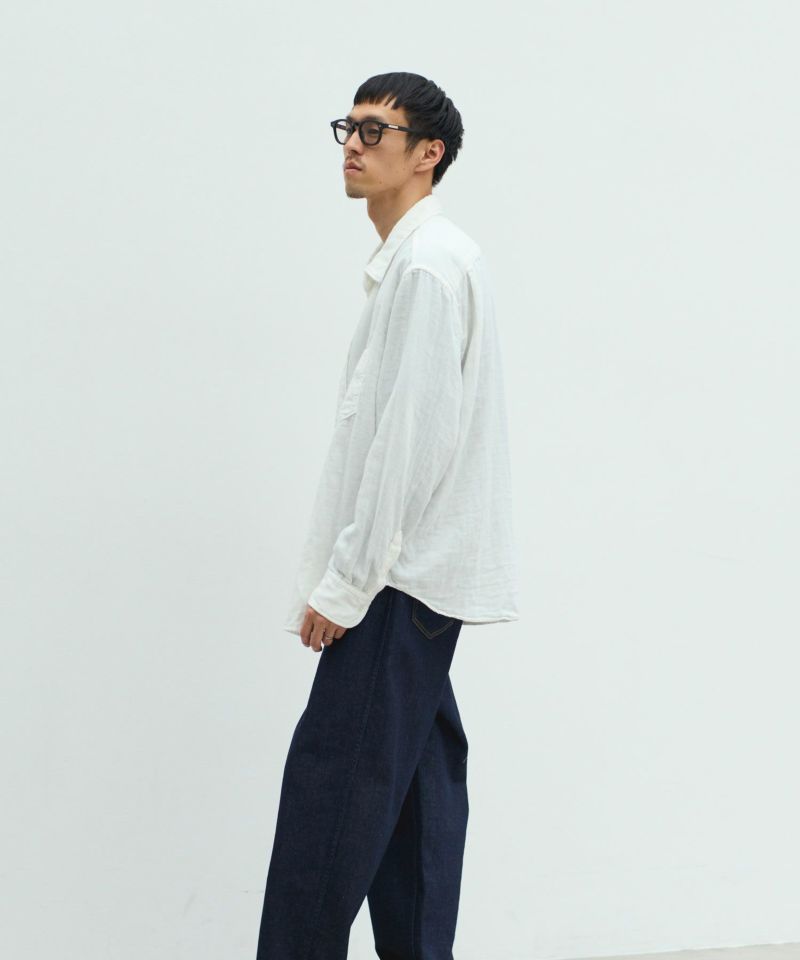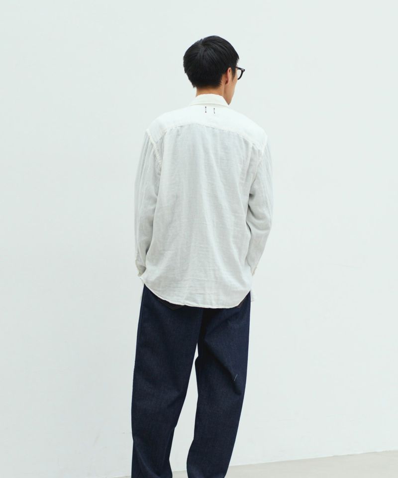 トップスでは最も長い歴を持つシグネチャーアイテムの1つであるダブルガーゼシャツをリニューアル。今の時代にあった「普通なのに、なんかカッコ良い」シルエットに作り変えました。昨今のビッグシルエットの流れに合せ、ユルッと脱力感のある着方が出来る様に身巾を持たせ、肩も少しドロップする様にしています。ボクシーでありながらも若干裾が細い逆三角的なフォルムに仕上げつつ、着丈はジーンズと相性の良いジャスト丈をキープしています。