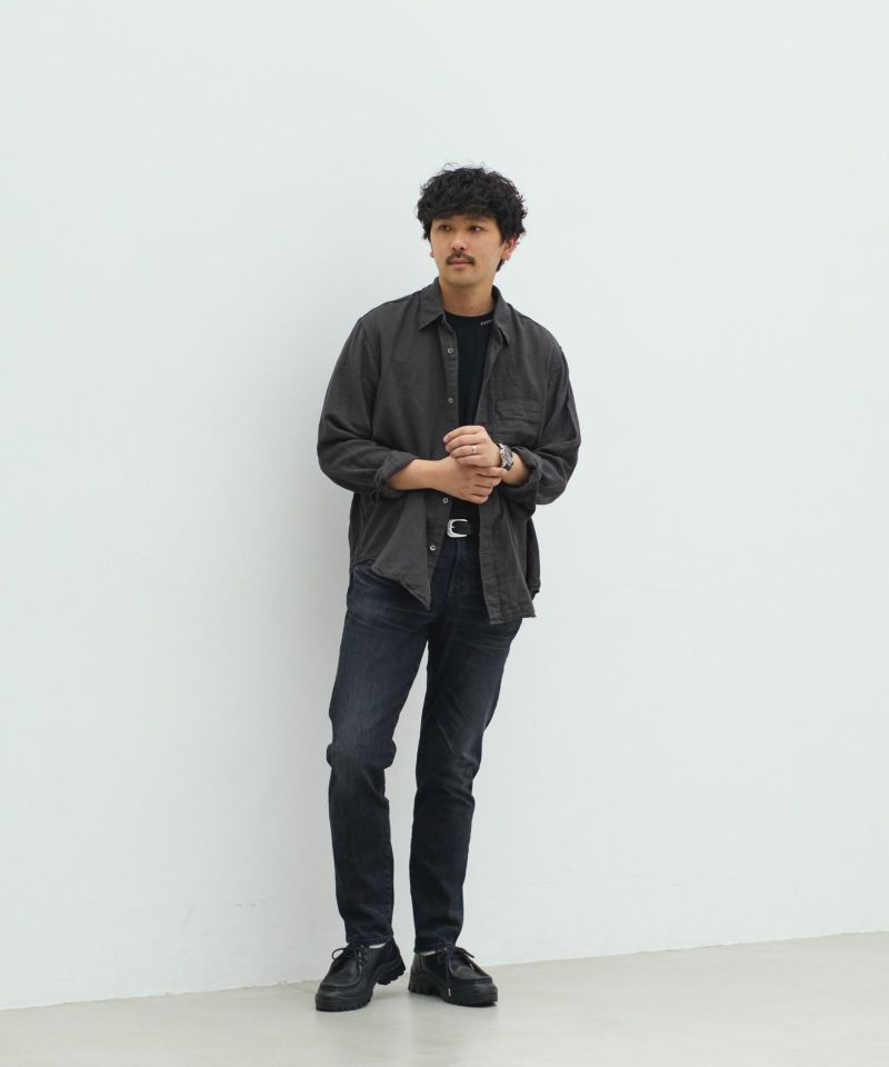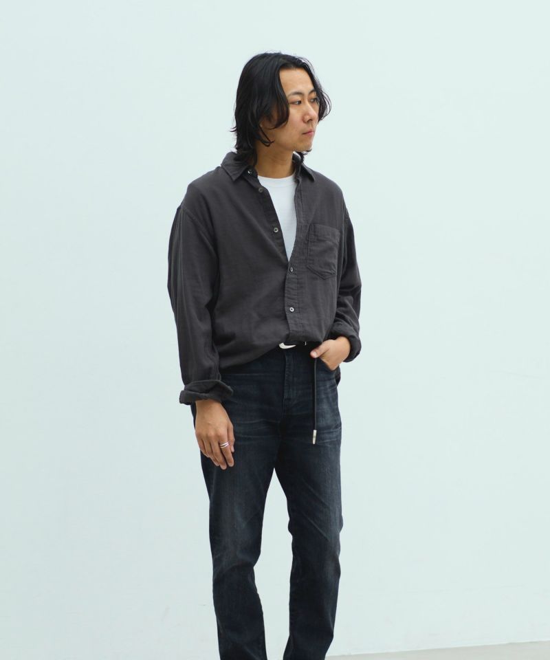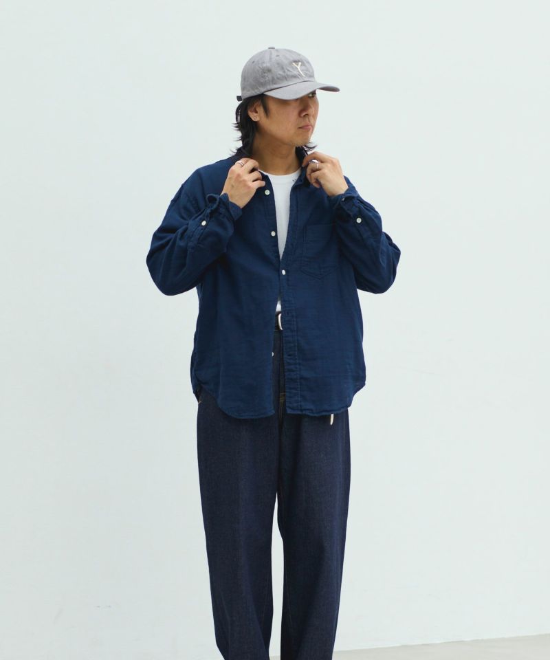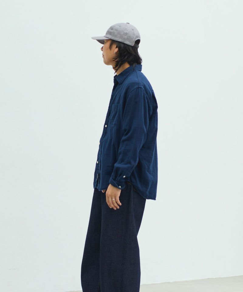 トップスでは最も長い歴を持つシグネチャーアイテムの1つであるダブルガーゼシャツをリニューアル。今の時代にあった「普通なのに、なんかカッコ良い」シルエットに作り変えました。昨今のビッグシルエットの流れに合せ、ユルッと脱力感のある着方が出来る様に身巾を持たせ、肩も少しドロップする様にしています。ボクシーでありながらも若干裾が細い逆三角的なフォルムに仕上げつつ、着丈はジーンズと相性の良いジャスト丈をキープしています。