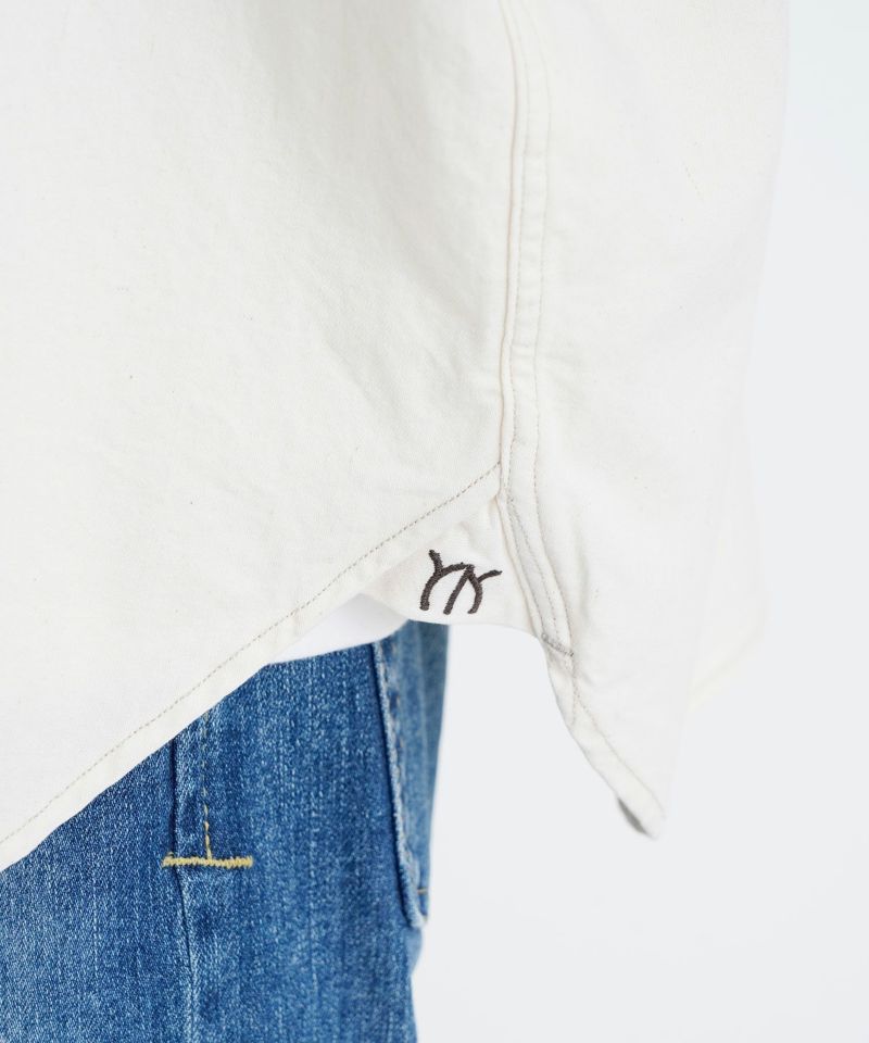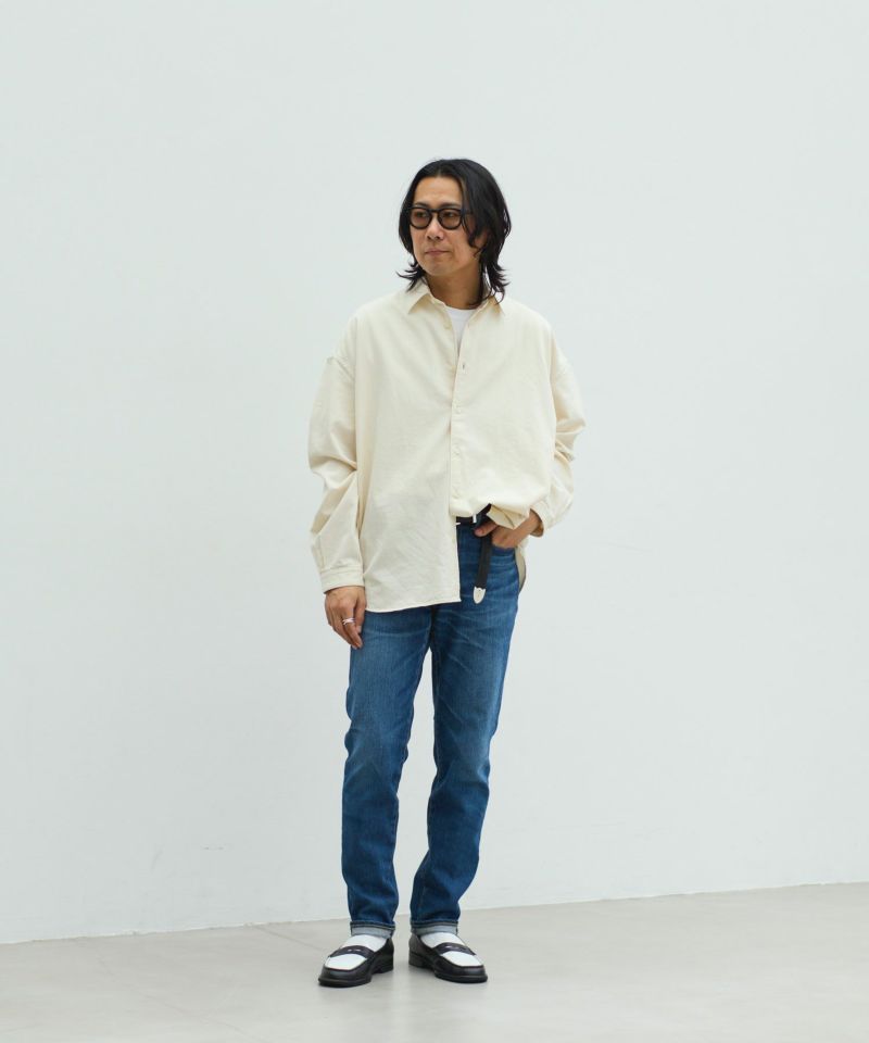 シワを気にせずラフに羽織れる白シャツを目指し、5ozの生成りデニムで作ったホワイトデニムシャツ。更に洗いによるUSED加工を施し、くたっとした風合いに仕上げました。あえてブリーチ加工等で真っ白にはせずに自然の色目を残し、白シャツとは一味違うコーディネートが楽しめる様に仕上げています。