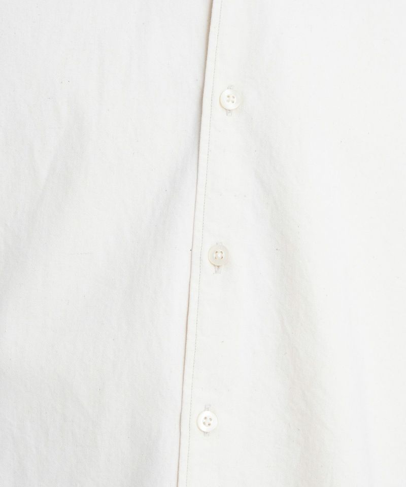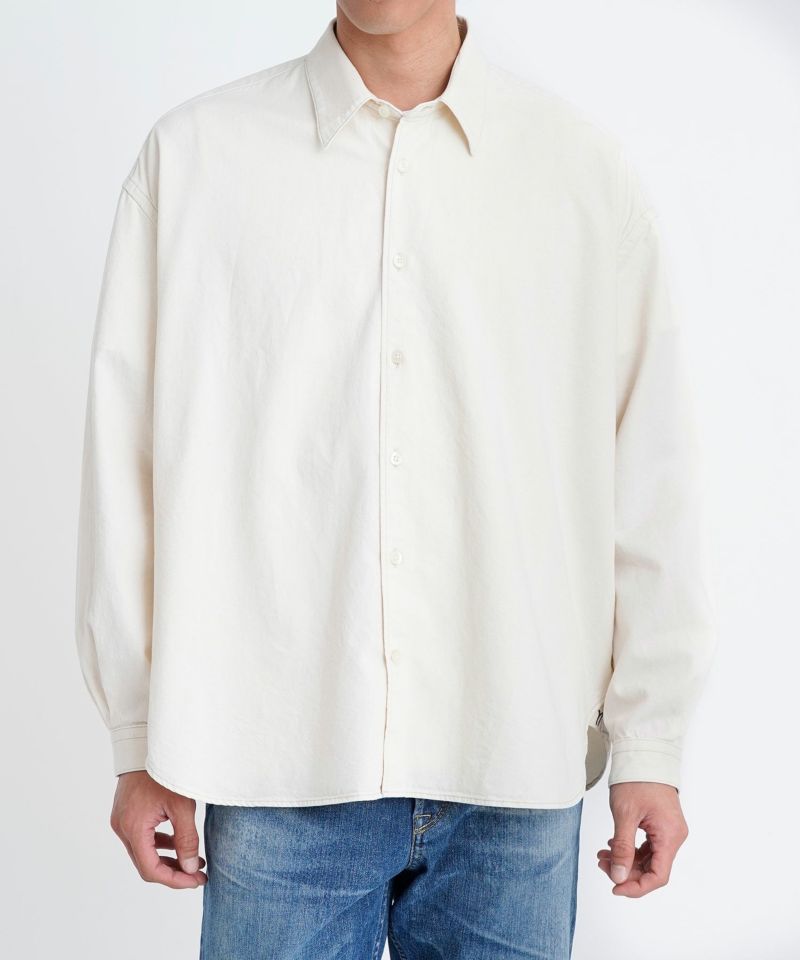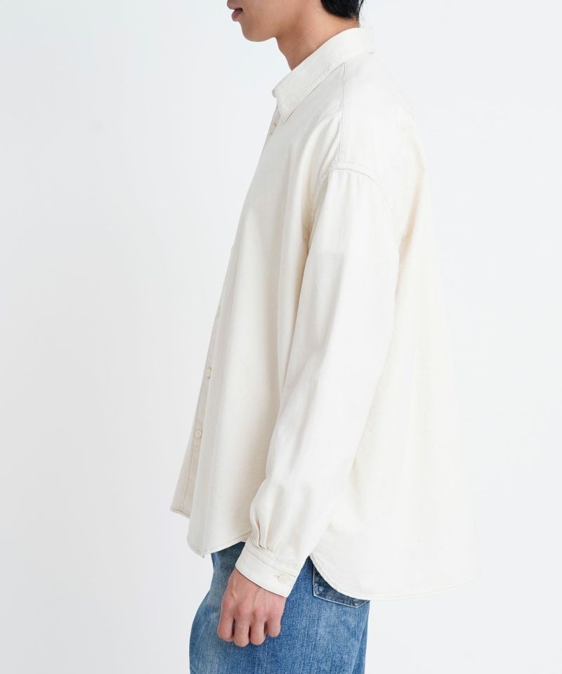 ゆったりとしたシルエットでありながら、丈感や袖丈はオーバーサイジングにならない大人なデザインシャツです。「デニシャツの様にシワも気にせずラフに羽織れる白シャツを!!」という声から5ozの生成りデニムで作ったデニムシャツを、洗いでUSED加工を施し、クタクタに仕上げました。あえて、ブリーチ等で真っ白にはせずに綿花そのままの色を残した生成りにし、白シャツとは一味違うコーディネートが楽しめます。