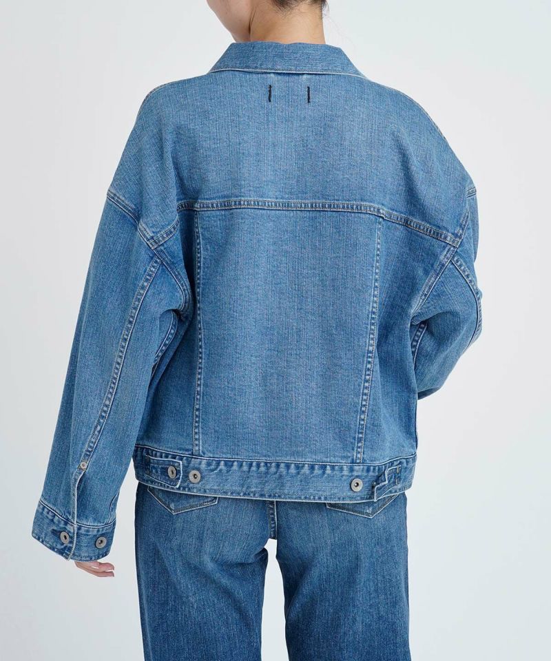 オーバーサイズでコンパクトな丈感が合わせやすい旬なジーンジャケットです。肩がドロップしたゆったりとした着心地のジーンジャケットです。ジャケットの中にボリュームのある袖のものもゆったり着れます。ゆったりしたフォルムですが、丈はコンパクトに、ワイドめなパンツにも合わせやすい丈感で、ゆったりと着崩して着用しても今っぽく着こなせます。