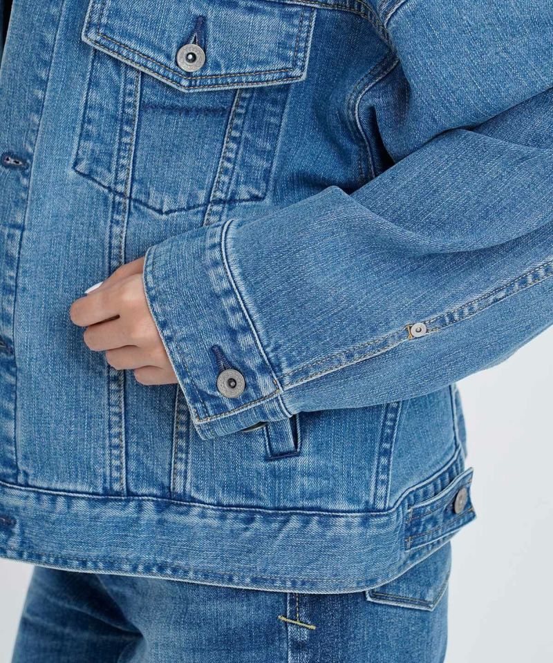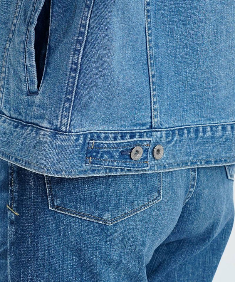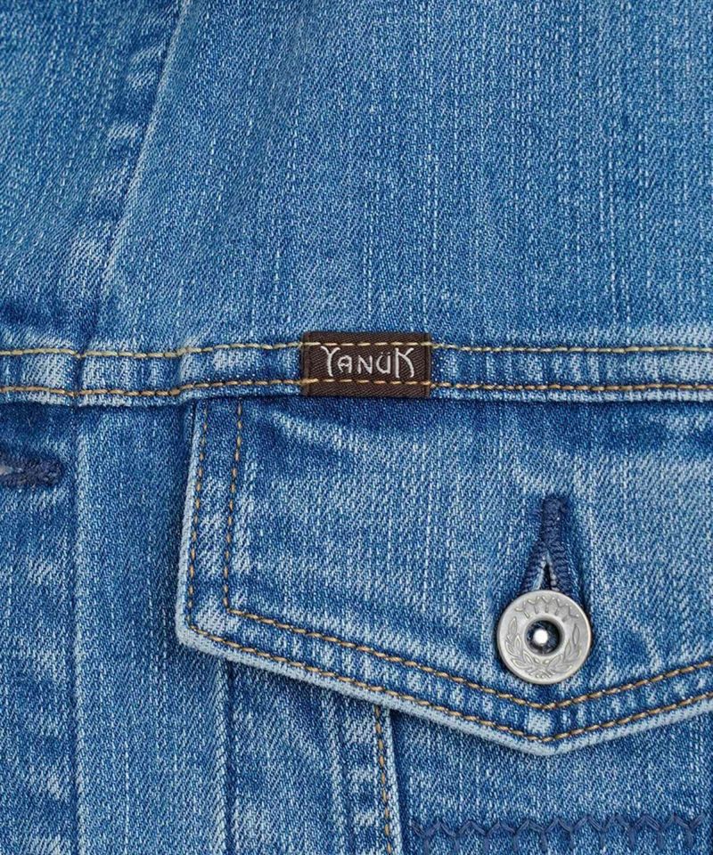 YANUKらしいきれいめの中淡色のジーンジャケットです。ヴィンテージのような自然で本格的でありながら、かつ女性らしさを残した加工感となっています。きれいなブルー色で年間通して着まわせるカラーです。