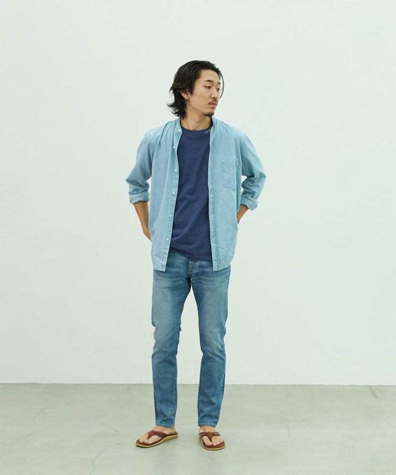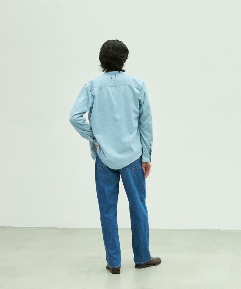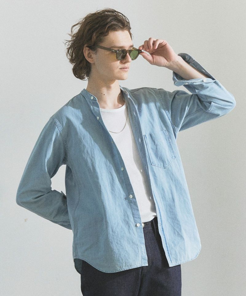 夏の定番シャツの一つバンドカラーシャツで、70年代の雰囲気の強い淡色デニムを採用しました。定番のイメージのあるデニムシャツを淡色USED加工で作ることでレトロ感を感じさせる夏のデニムシャツに仕上げました。ステッチやボタン、Y刺繍をホワイトにすることで、より涼し気な印象になっています。