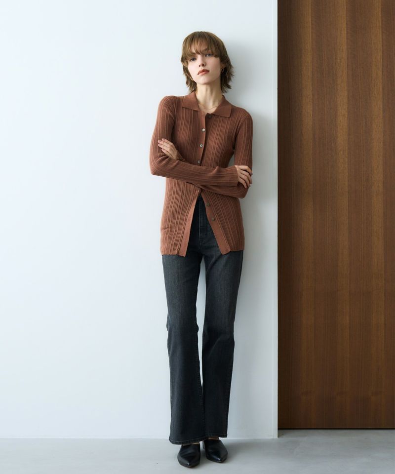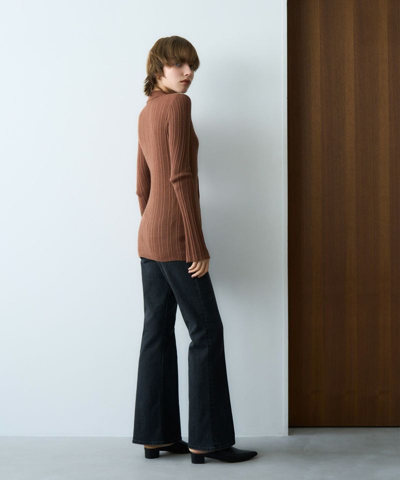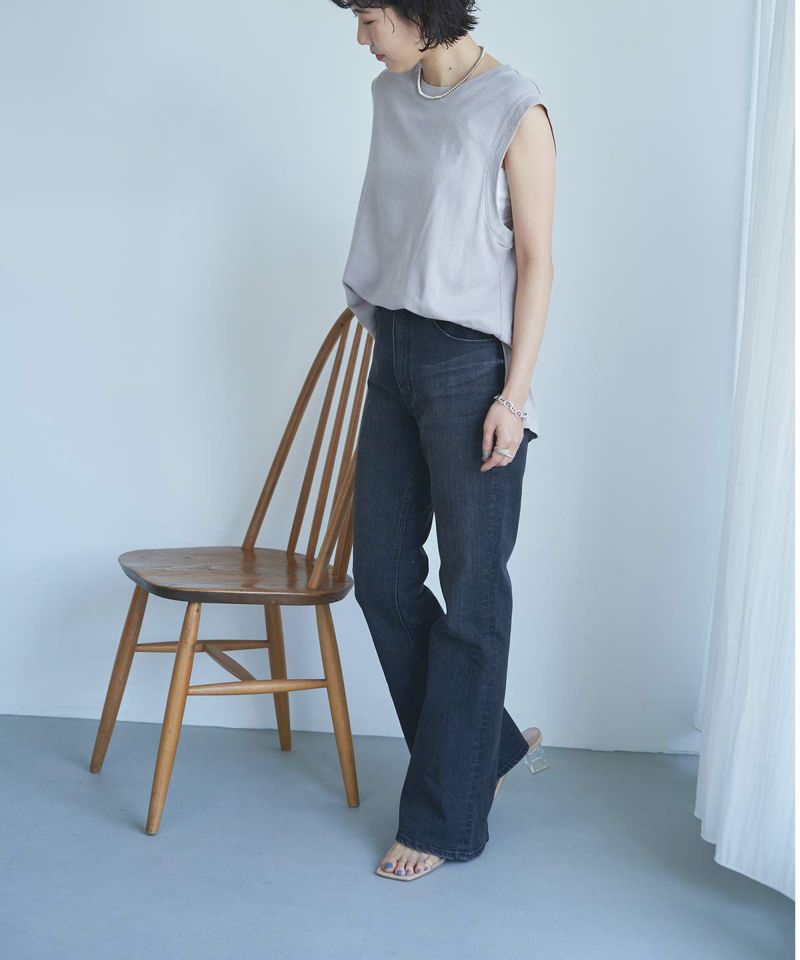穿きやすさを追求し、脚がきれいに見える美しいバランスのブーツカットです。膝のしぼりをなだらかにし、裾巾も広すぎない絶妙な広さにすることで、脚がキレイに見えるラインにしています。膝位置を高めに設定し、高めの位置からなだらかにフレアが始まるので、脚が長く見える効果も期待できます。後ろ姿も美しく見えるよう、後ろヨークとポケットのバランスを調整しています。ハイウエストなので、トップスインして着ていただくのもおすすめです。
