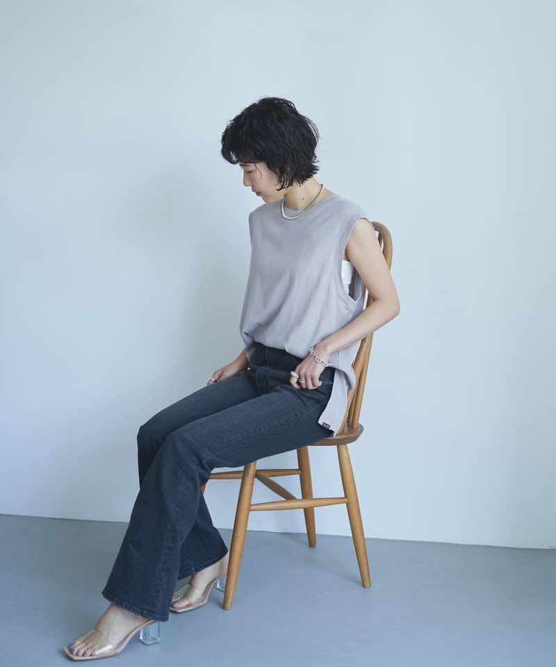 大人っぽく穿けるユーズドブラック。モモのスリが内側寄りに入っていることで、脚をきれいに見せてくれます。黒の強めな印象を和らげるマイルドな古着風加工を施しています。加工が控えめなので、ブラックデニムでありがちなハードすぎる印象にはならず、コーディネートに溶け込みやすい1本です。