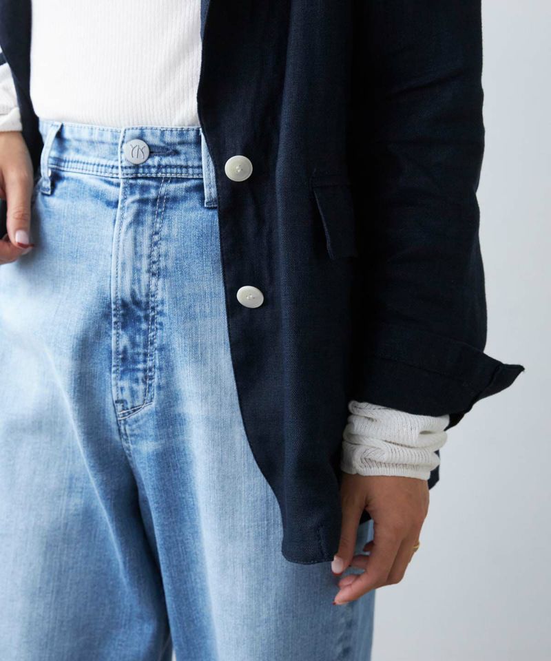 太腿から裾にかけて太いシルエットのストレート。メンズの太めジーンズを女性が穿きこなすようなイメージです。メンズライクな印象にするため、あえて股ぐりを長めに設定し、ヨークの幅や後ポケットを大きくしています。実際にメンズサイズを穿こうとするとウエストが合わなかったり、重さで下がってしまったりと、女性らしい上品見えが難しいですが、JOANは、ウエストがキュッと入ったジャストサイズなので、メンズライクなジーンズでも、女性らしく上品に穿いていただけます。ボリュームのあるパンツですが、ウエストがキュッと入っていることにより、パンツのボリュームとウエストのギャップで華奢見え効果も生まれます。また、ボリュームが横に広がらず、ヒップの高さから下に落ちるので、後ろ姿の野暮ったさもありません。脚の形を気にせず穿ける太めストレートなので体型を選ばず着ていただけます。