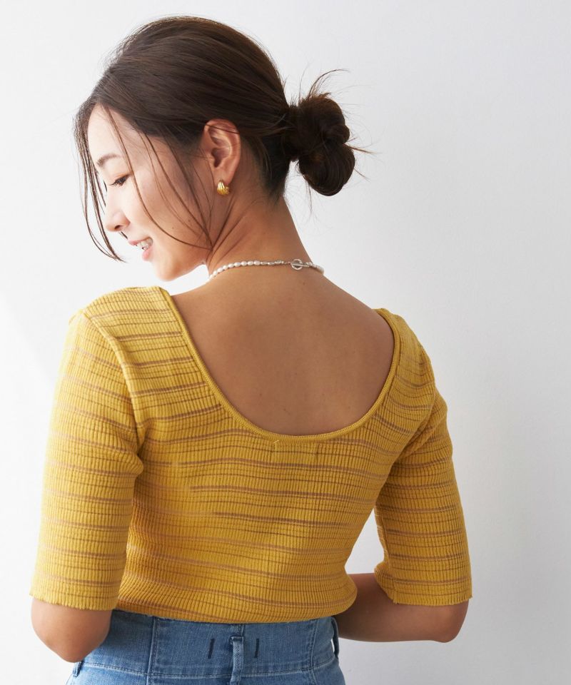 麻のようなシャリ感のある糸を使い、夏でもサラッと着れる5分袖のニットです。透明の糸とマルチボーダーを組み、程よい大人の透け感を演出します。透け感がありながらボーダーのカジュアル感も相まって、デイリーに使いやすいアイテムです。
