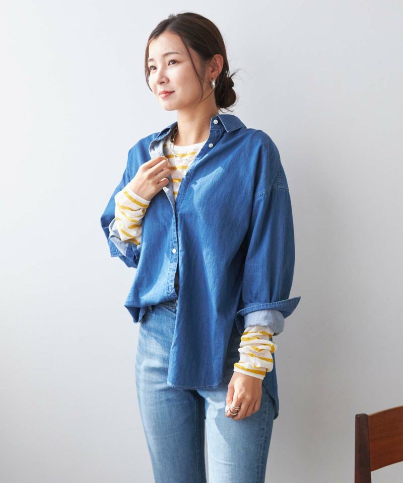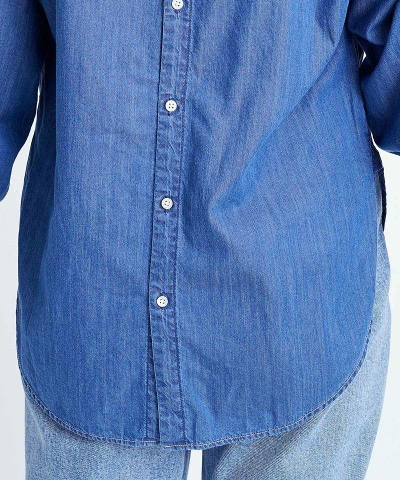 シンプルながらデザイン性のあるバックボタンのデニムシャツです。シルエットは、すっきりとしたボクシーシルエット。キチンと見えするシャツですが、着方でイメージを変えられる万能シャツです。ポイントは後ろにボタンがついていて、後ボタンをあけて着るとスリットのように見せられます。前ボタンをしっかり閉めてボトムスにインするとクラシカルムードに。第2ボタンまであけて衿をぬき、前だけインするとラフなムードにもなります。ミドルウエストのパンツには裾を出して、ハイウエストのパンツには前だけインするとコーディネートのバランスがとりやすいです。