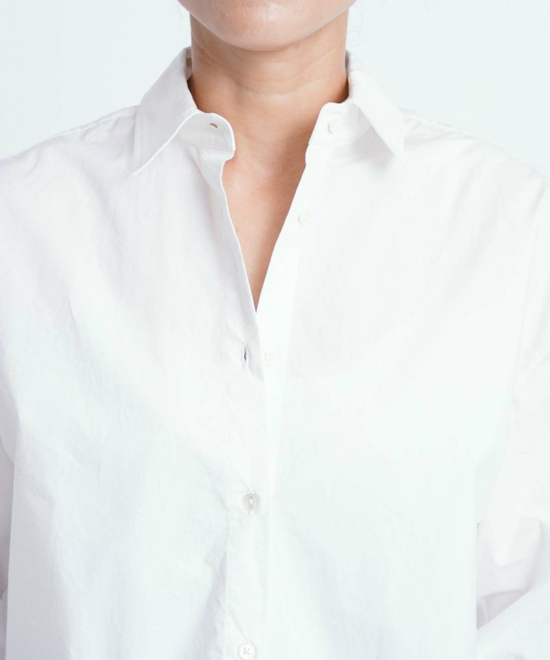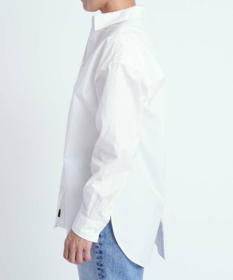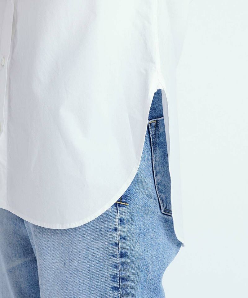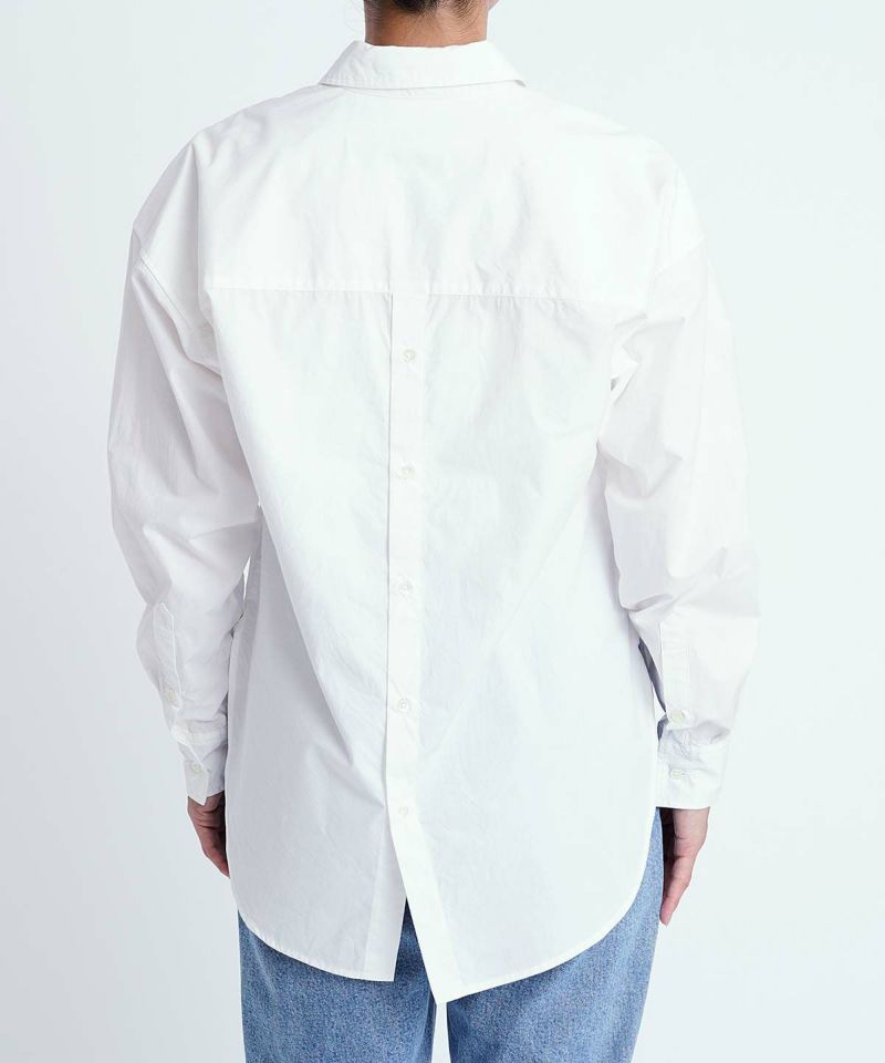 シンプルながらデザイン性のあるバックボタンのデニムシャツです。シルエットは、すっきりとしたボクシーシルエット。キチンと見えするシャツですが、着方でイメージを変えられる万能シャツです。ポイントは後ろにボタンがついていて、後ボタンをあけて着るとスリットのように見せられます。前ボタンをしっかり閉めてボトムスにインするとクラシカルムードに。第2ボタンまであけて衿をぬき、前だけインするとラフなムードにもなります。ミドルウエストのパンツには裾を出して、ハイウエストのパンツには前だけインするとコーディネートのバランスがとりやすいです。