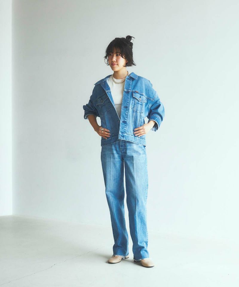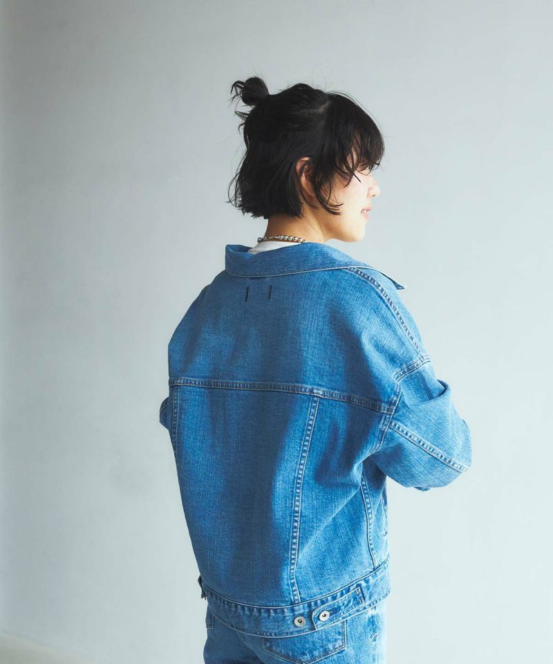 オーバーサイズでコンパクトな丈感が合わせやすい旬なジーンジャケットです。肩がドロップしたゆったりとした着心地のジーンジャケットです。ジャケットの中にボリュームのある袖のものもゆったり着れます。ゆったりしたフォルムですが、丈はコンパクトに、ワイドめなパンツにも合わせやすい丈感で、ゆったりと着崩して着用しても今っぽく着こなせます。