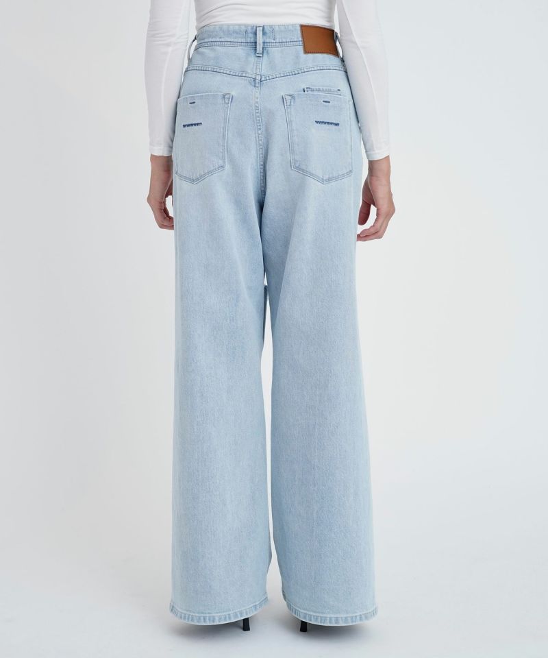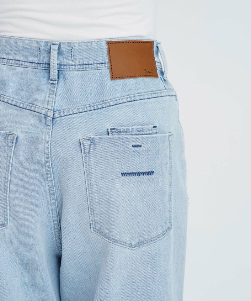 太めのワイドシルエットながら、ウエストを少し入れてあげることで、女性らしさも兼ね備えたシルエットに仕上がっています。両足に施されたカットクラッシュは、ルーズな印象になりすぎないよう、高めの位置に設定しています。それにより、丈直しをしてもクラッシュ位置のバランスが悪くならないというメリットもあります。裾のステッチ巾は、YANUKインラインよりも太めの巾になっており、足元にアクセントを効かせた樋口さんこだわりのディテールです。