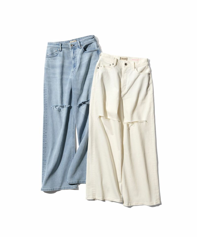 ファッション誌やウェブ等で捻りの効いたスタイリングの数々で読者を魅了しているスタイリスト樋口かほりさんが、いま穿きたいジーンズとして手掛けた大人のためのクラッシュワイドデニムです。